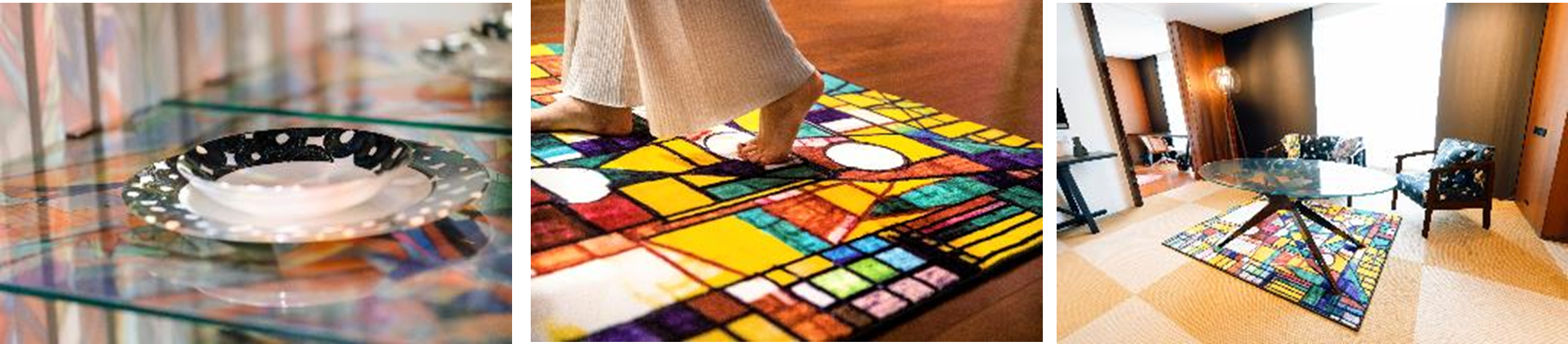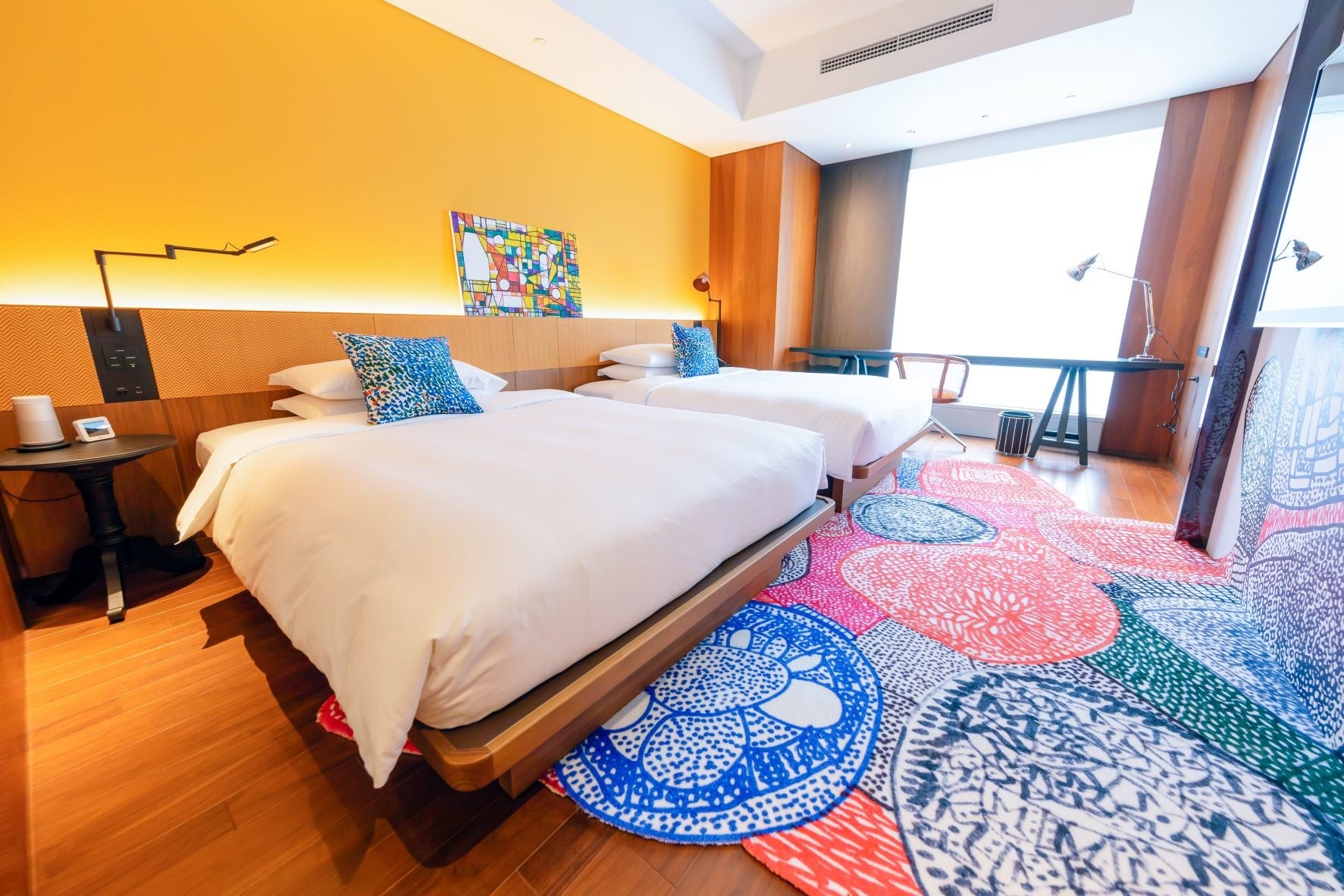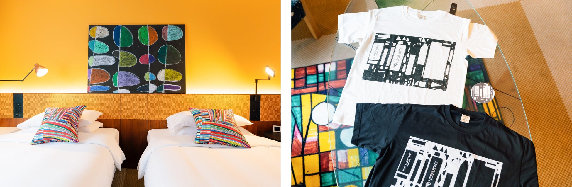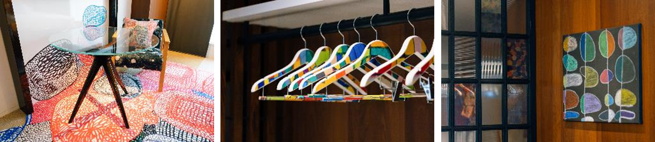 知的障害のあるアーティストが生み出す、異彩を放つアートの力で、訪れるゲストの方々の感性を刺激し、新たな視界や価値観が生み出される宿泊体験を通じて、豊かな気持ちを味わっていただけるようなコンセプトルームをスタンダード、スイートの各タイプで両社が手掛け、乃村工藝社に空間デザイン・施工協力いただきました。期間中、各室一日一組限定でご宿泊いただける特別な客室で、異彩を放つアートをさまざまな素材・手法で取り入れ、「ヘラルボニー」の世界観を楽しめるインテリアに加え、手に取ってご使用いただけるアイテムのセレクトにもこだわり、空間全体を演出します。