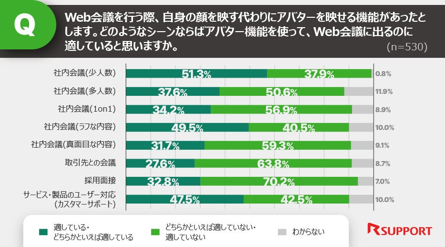 アバターでの会議参加に対して、社内会議ではなく、社外や取引先との会議での活用は否定的な声が多数を占める結果となりました。一方で、社外とのやり取りであっても、アバターを利用したカスタマーサポートに関しては、全体の5割弱が肯定的である結果となりました。