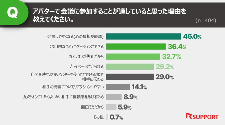 アバターで会議に参加することに肯定的な回答をした方に、アバターでの参加が適している理由を聞いたところ、「発言しやすくなる(心の負担が軽減する)」が最多の46.0%でした。次点が「より自由なコミュニケーションができる」で36.4%、「カメラオフだと失礼だから」が32.7%という結果になりました。