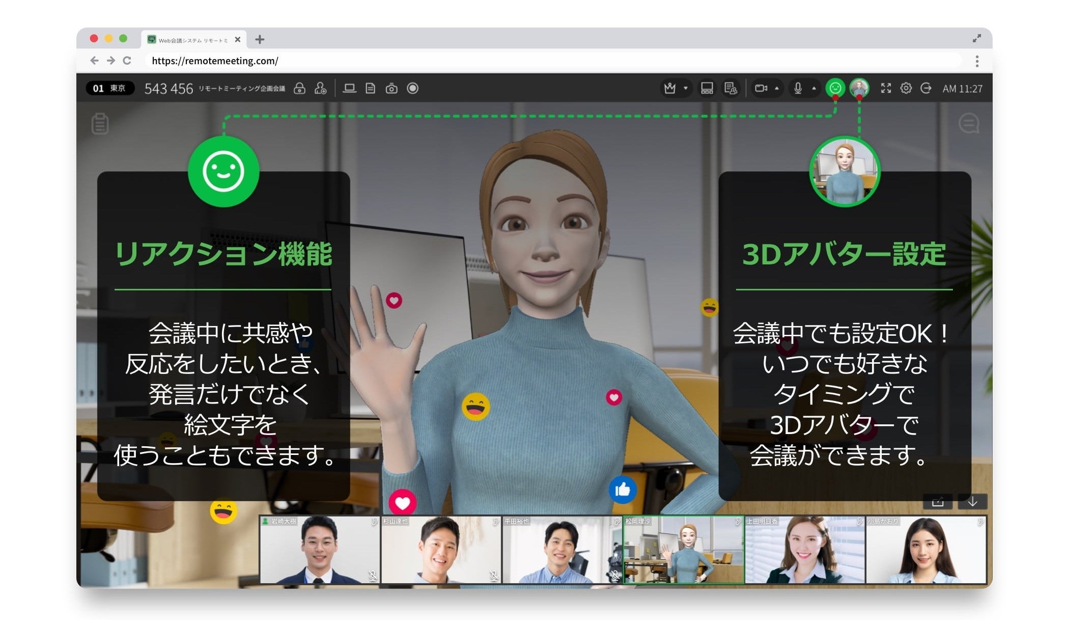 当社が提供する「RemoteMeeting」からは、昨年のアップデートで自分の代わりに3Dアバターで会議に参加できる機能が登場。前回の調査にてカメラオフの理由の第1位であった「長時間自分の顔が見たくない」と感じる方でも、10種類の中から自身の好きなアバターで参加することができます。