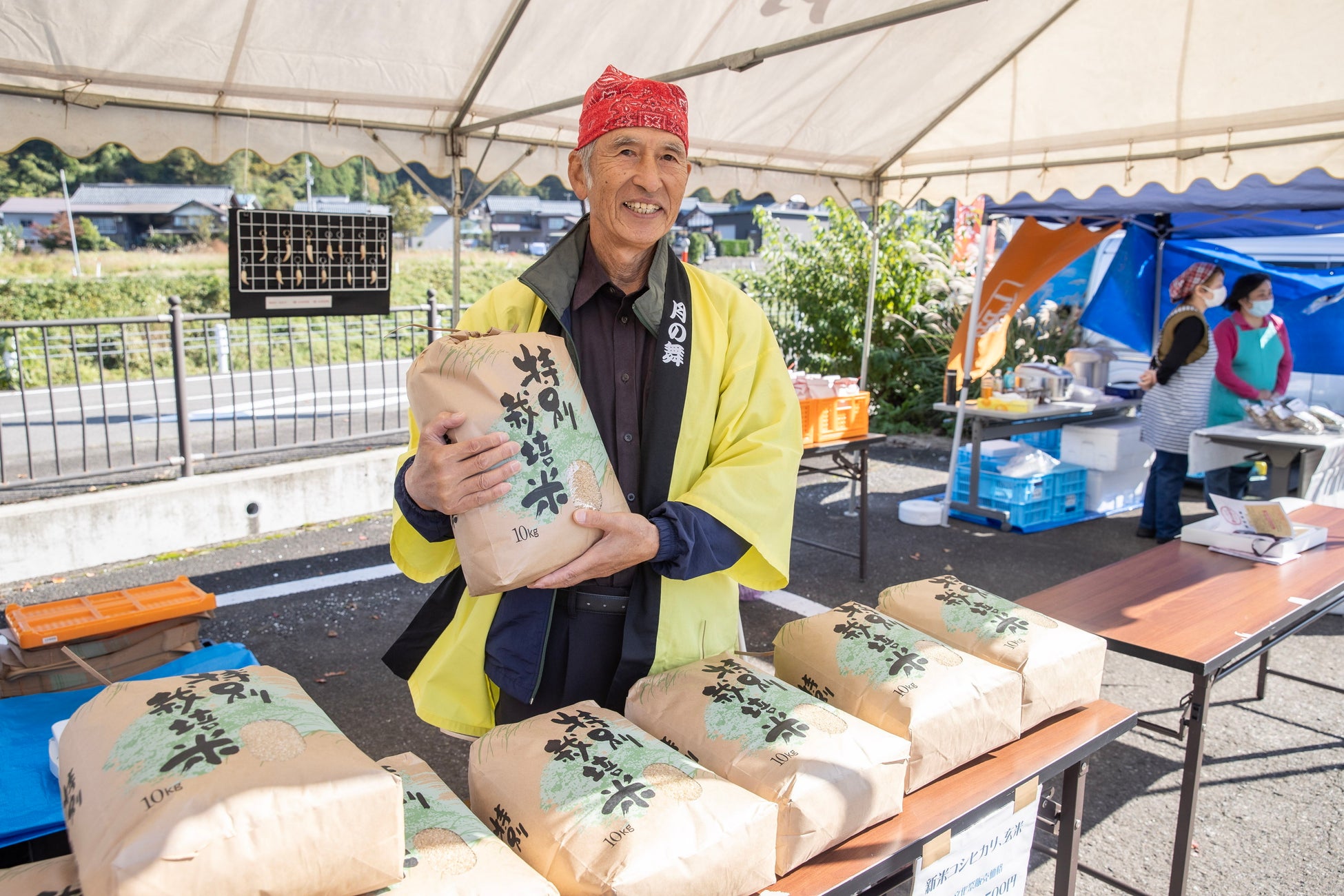 米俵(男性は約60㎏、女性は約30㎏、小学生は約20㎏)を肩の上まで担ぎ上げることができた方に池田の新米(2㎏)をプレゼントする毎年大人気の企画です。初日は81人、2日目は177人、のべ258人もの方に参加いただきました。
