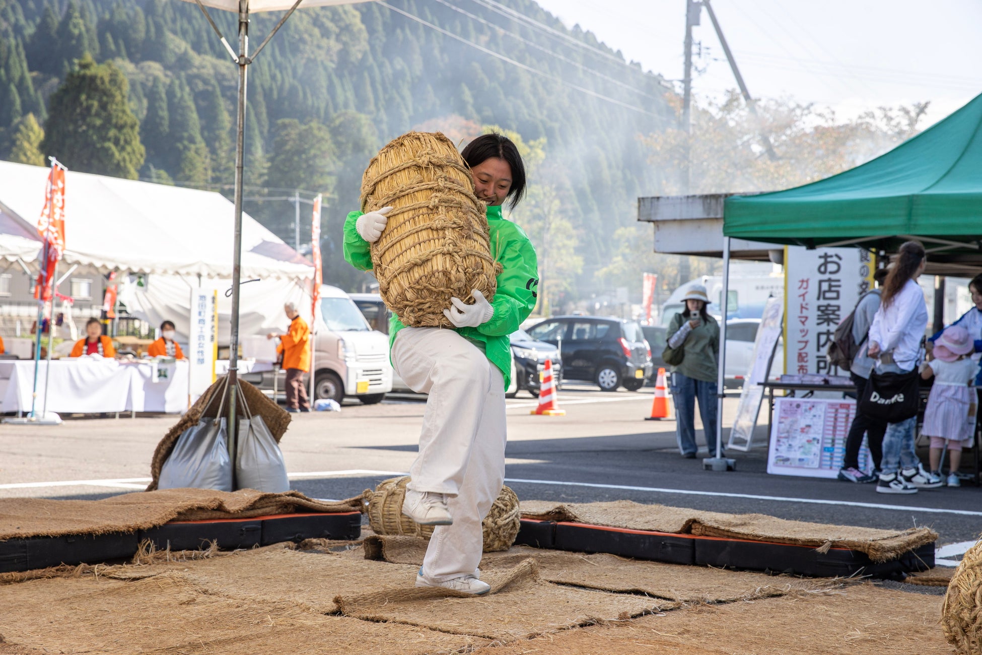 初めて見る米俵に興味津々に見入る方も多く、参加者が俵を持ち上げると、会場からは多くの拍手や歓声が飛び交いました。また、家族で挑戦する人や毎年参加する方も見られ、アドバイスが飛び交うなど会場は大いに盛り上がりました。