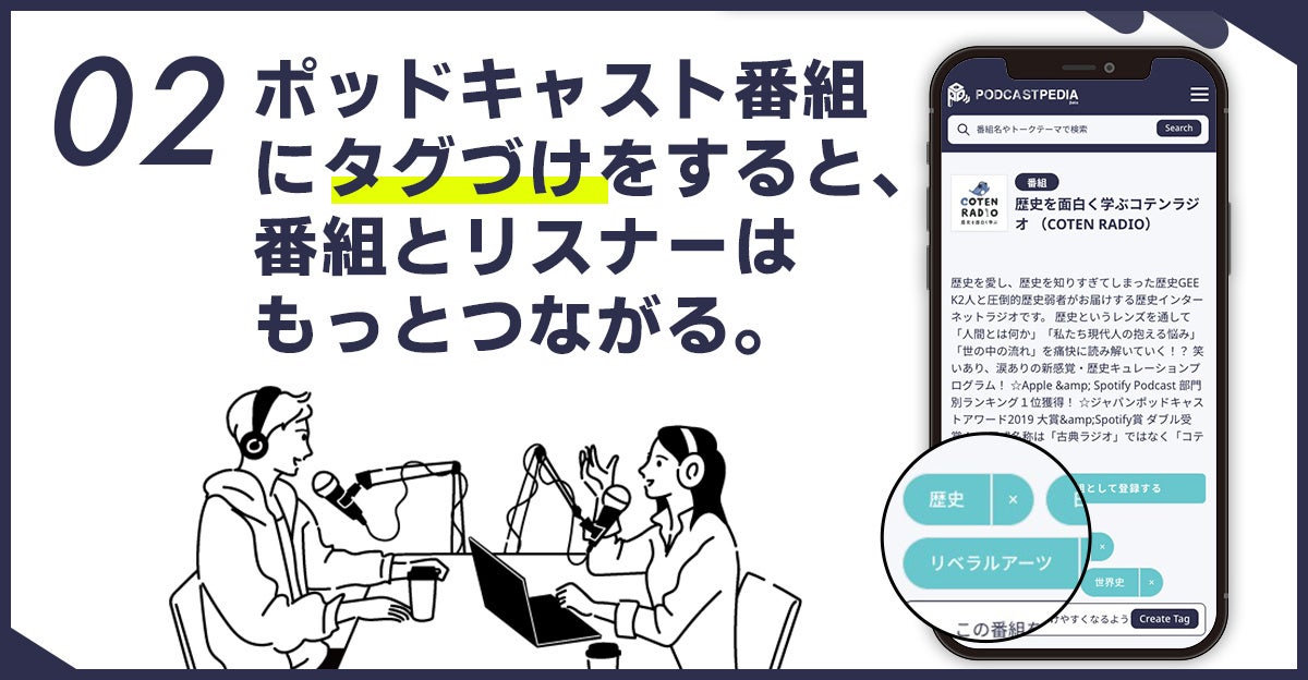 サイト上のタグ(特定のキーワード)で番組が探せるようになることで、より偶発性の高いリスナーとポッドキャスト番組の出会いを創出します。