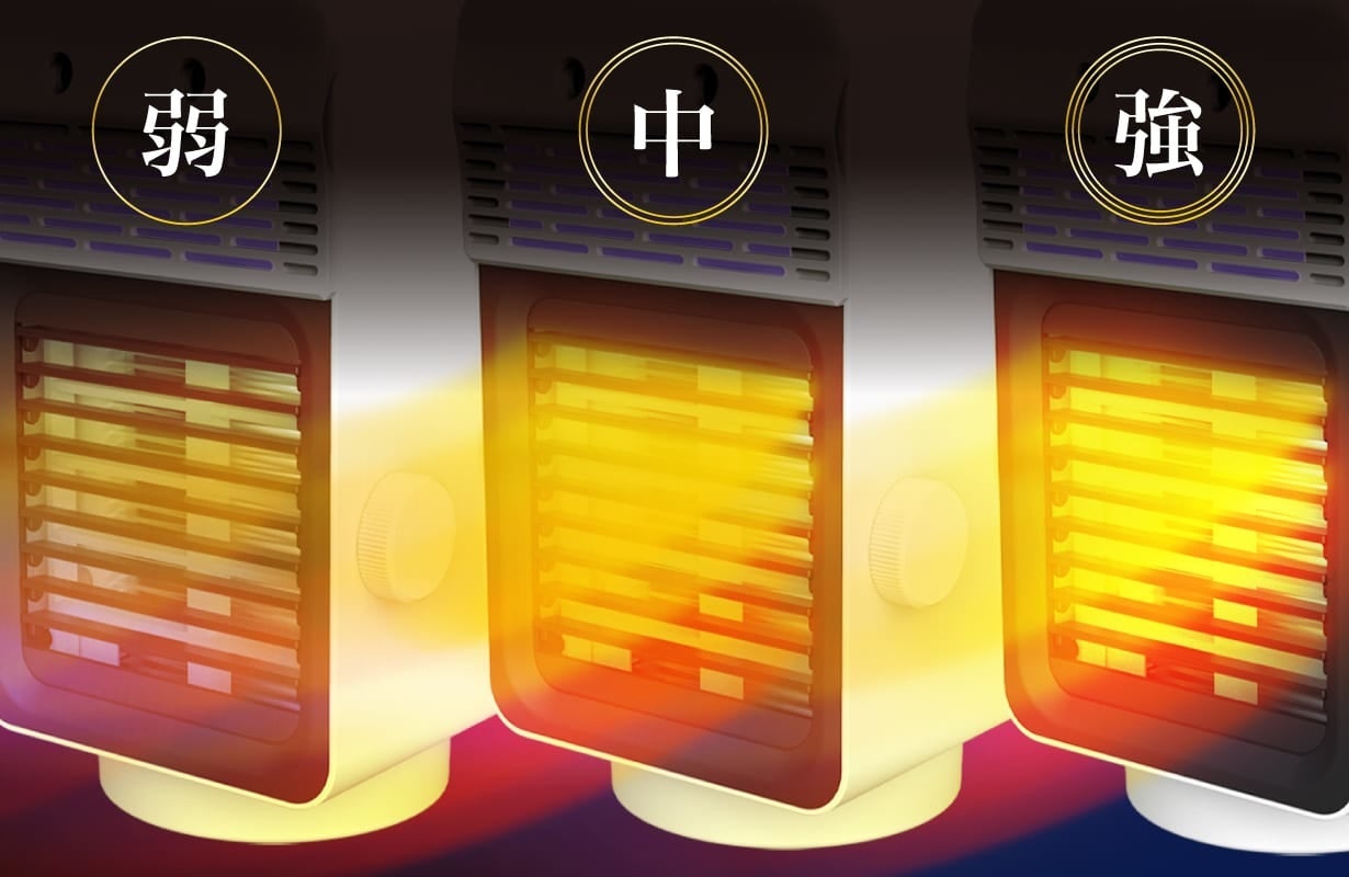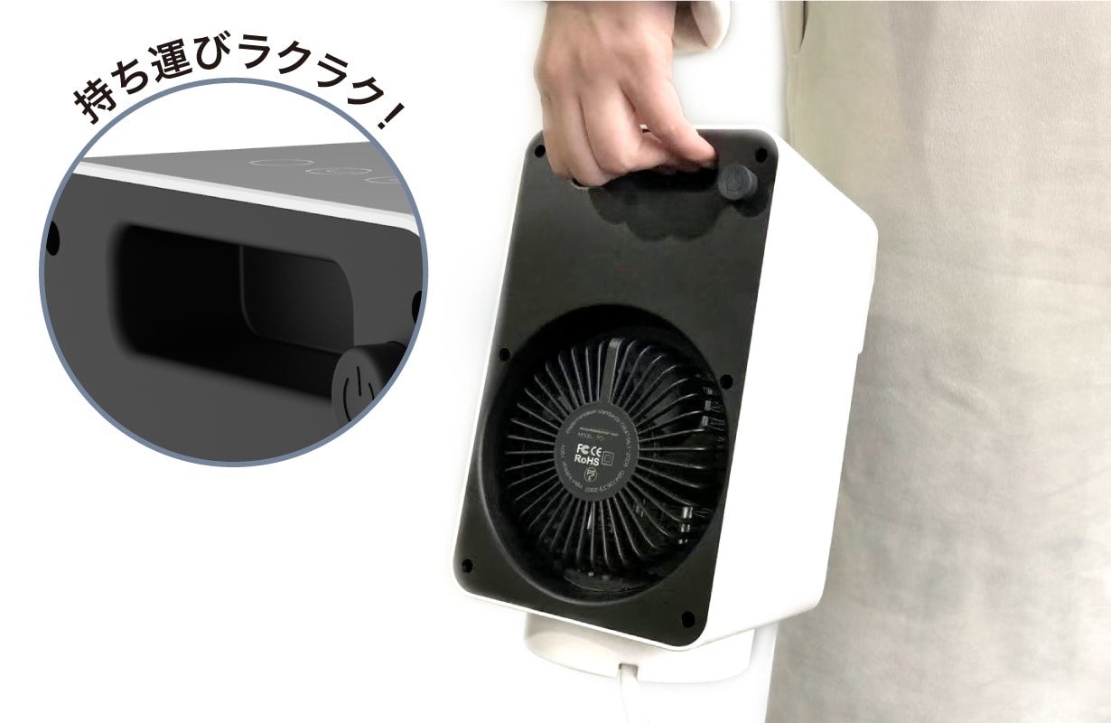セラミックヒーターを採用しているので温かくなるまでが早く、燃料を使わず電気でセラミックを発熱して空気を暖める為、他暖房機器特有の嫌な臭いもせず、換気をする必要もありません。