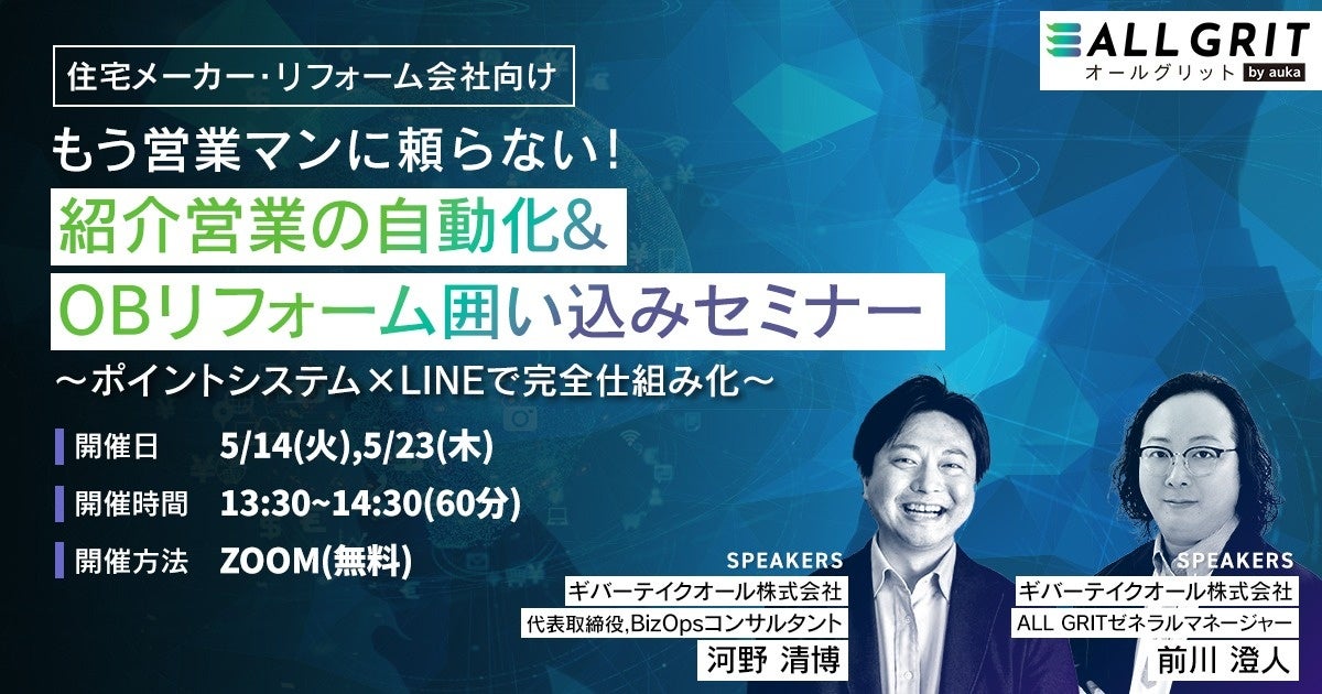 住宅・不動産業界向けLINE運用ツール《ALL GRIT(オールグリット)》を提供するギバーテイクオール株式会社(本社:東京都港区、代表取締役CEO 河野清博、以下当社)は、この度、住宅メーカー様・工務店様に向けて『紹介営業の自動化&OBリフォーム獲得セミナー』を開催いたします。