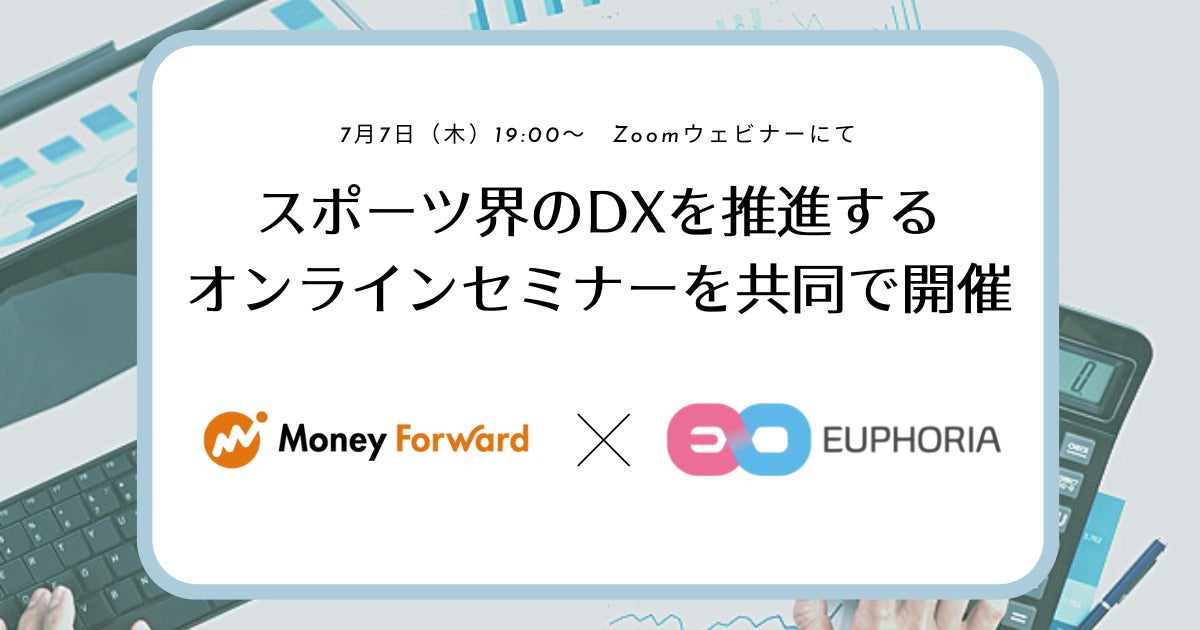 株式会社ユーフォリア(本社:東京都千代田区 共同代表:橋口 寛/宮田 誠、以下 ユーフォリア)は、スポーツ界のDX推進を目的に、バックオフィスSaaS『マネーフォワード クラウド』などを展開する株式会社マネーフォワード(本社:東京都港区 代表:辻 庸介、以下 マネーフォワード)と協業を開始します。本取り組みの一環として、広くスポーツ団体のフロントスタッフ・経理/人事労務担当者を対象とした無料のオンラインセミナーを7月7日(木)に開催いたします。