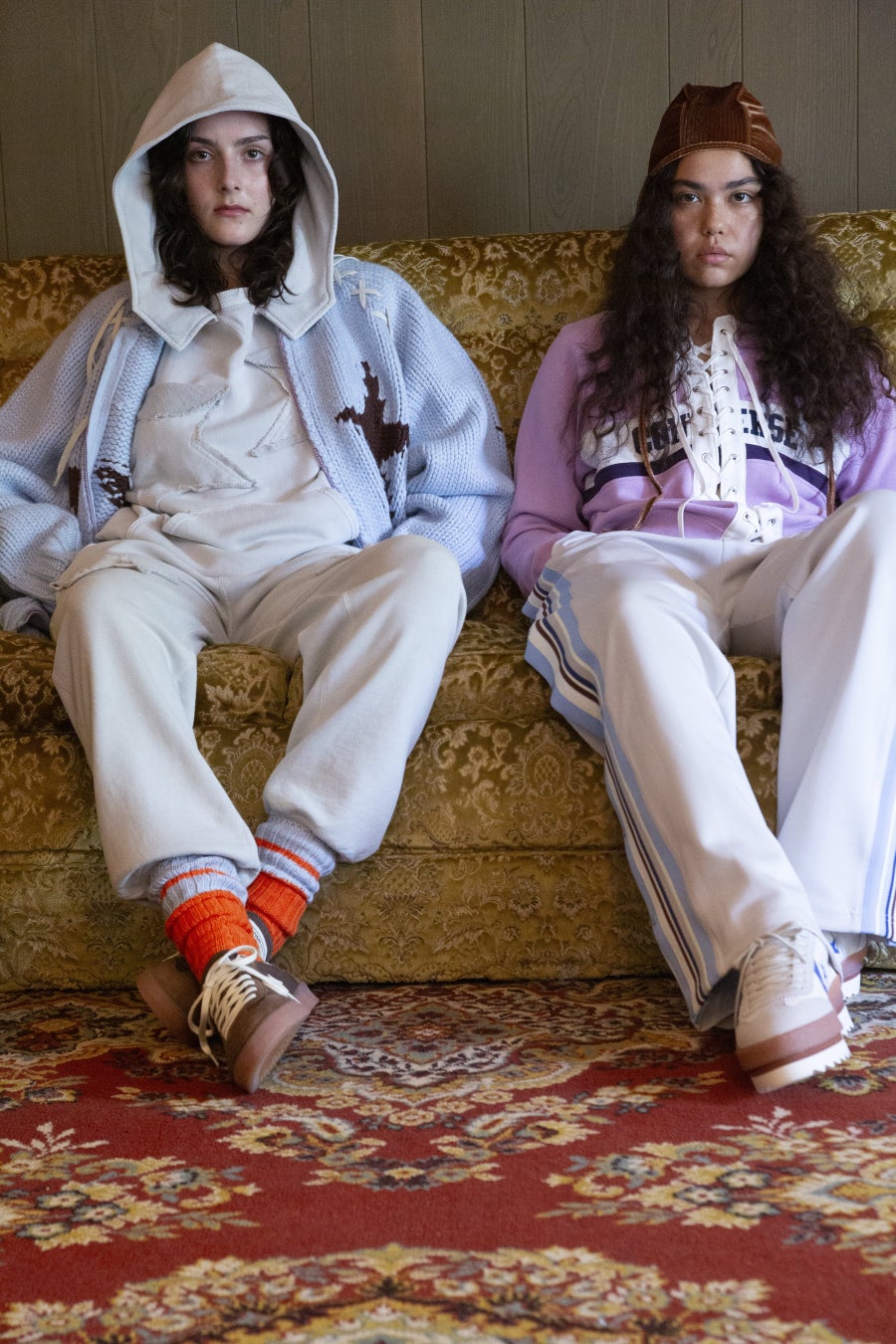 キャンバス素材のアッパーに、トウと踵にはスエードを採用し、素材のコントラストと耐久性を両立しています。シャークソールをベースに厚底仕様にアップデートし、〈kotohayokozawa〉らしいカラーリングとディテールで存在感と独特なエッジを効かせた一足に仕上げています。インソールにはフォトプリントを施し、見えない部分にもコラボレーションならではのポイントを詰め込みました。シューレースはシンプルなホワイトと、タンと連動したイエローの2種類が付属し、気分やスタイリングに合わせて、自由な表情の変化を楽しめます。