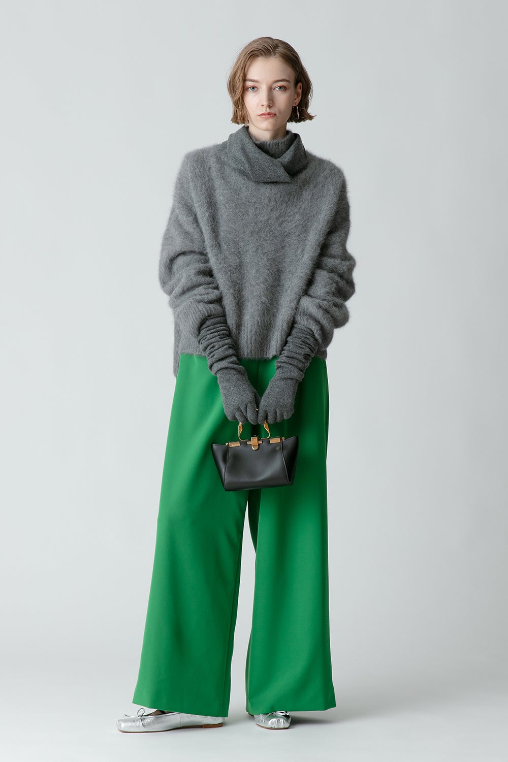 ワイドなシルエットながら、しなやかな素材感だから上からトップスを重ねてもおすすめ。鮮やかなグリーンは着こなしのポイントに。
