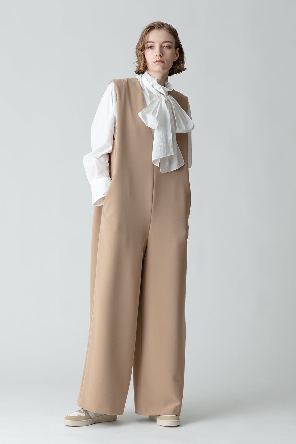 ボウタイブラウスと合わせればオールインワンの柔らかな素材感と相まって女性らしい雰囲気に。肩から脇にかけて立体的なカッティングが施されているので、ワイドシルエットをキープしながらも、サイドから見たシルエットも美しい。