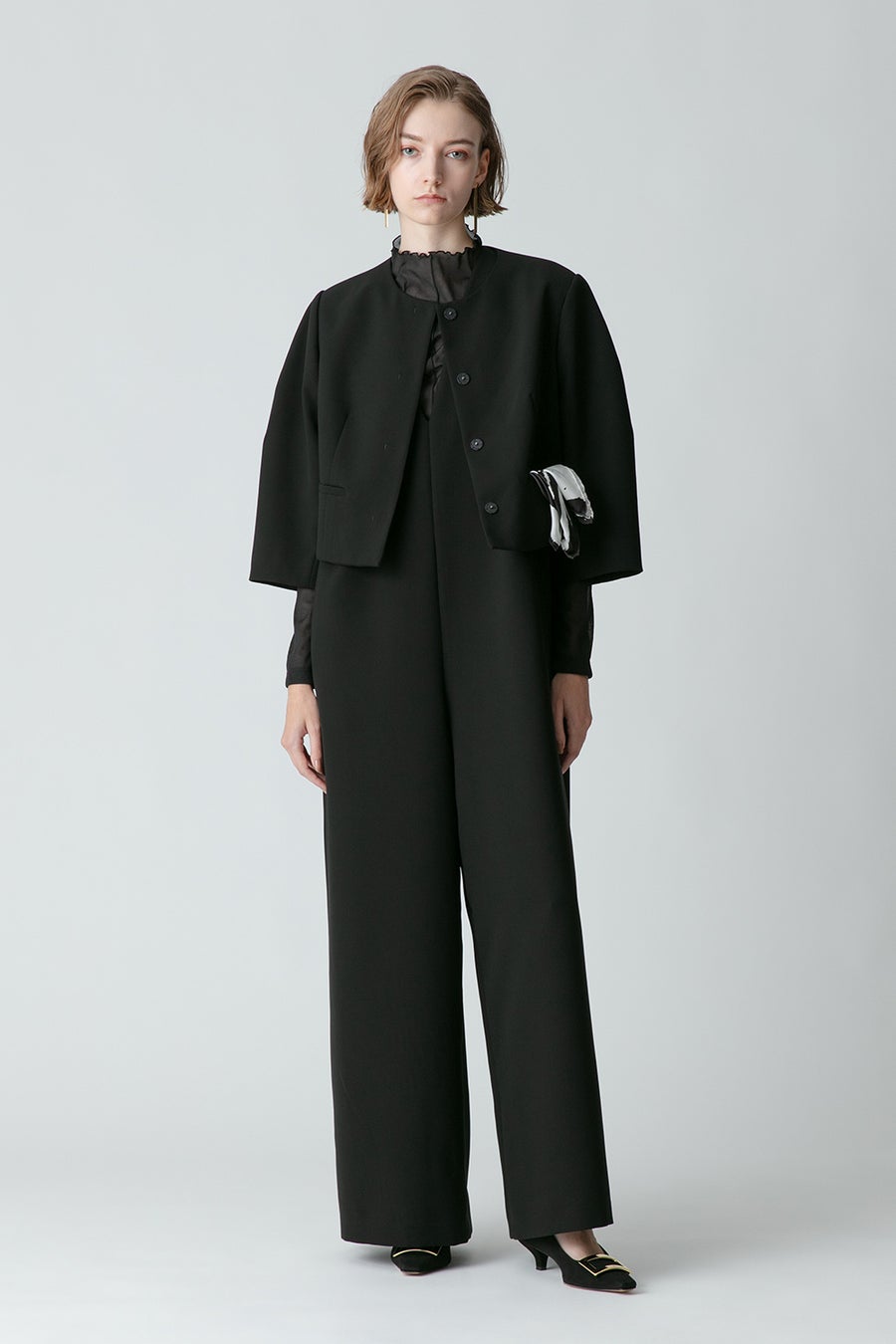 同素材でジャケットも展開。セットアップで着れば特別なシーンにも。ノーカラーに短めの袖丈で、丸みのあるシルエットがクラシカルに演出。単品でも活躍の予感。