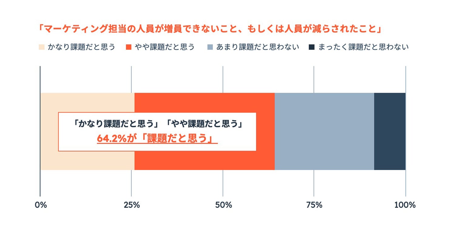 「例年と比較して予算が不足していることを課題に感じている」回答者は全体の約6割、「マーケティング担当の人員が増員できないこと、もしくは人員が減らされたことを課題に感じている」回答者が64.2%にのぼりました。