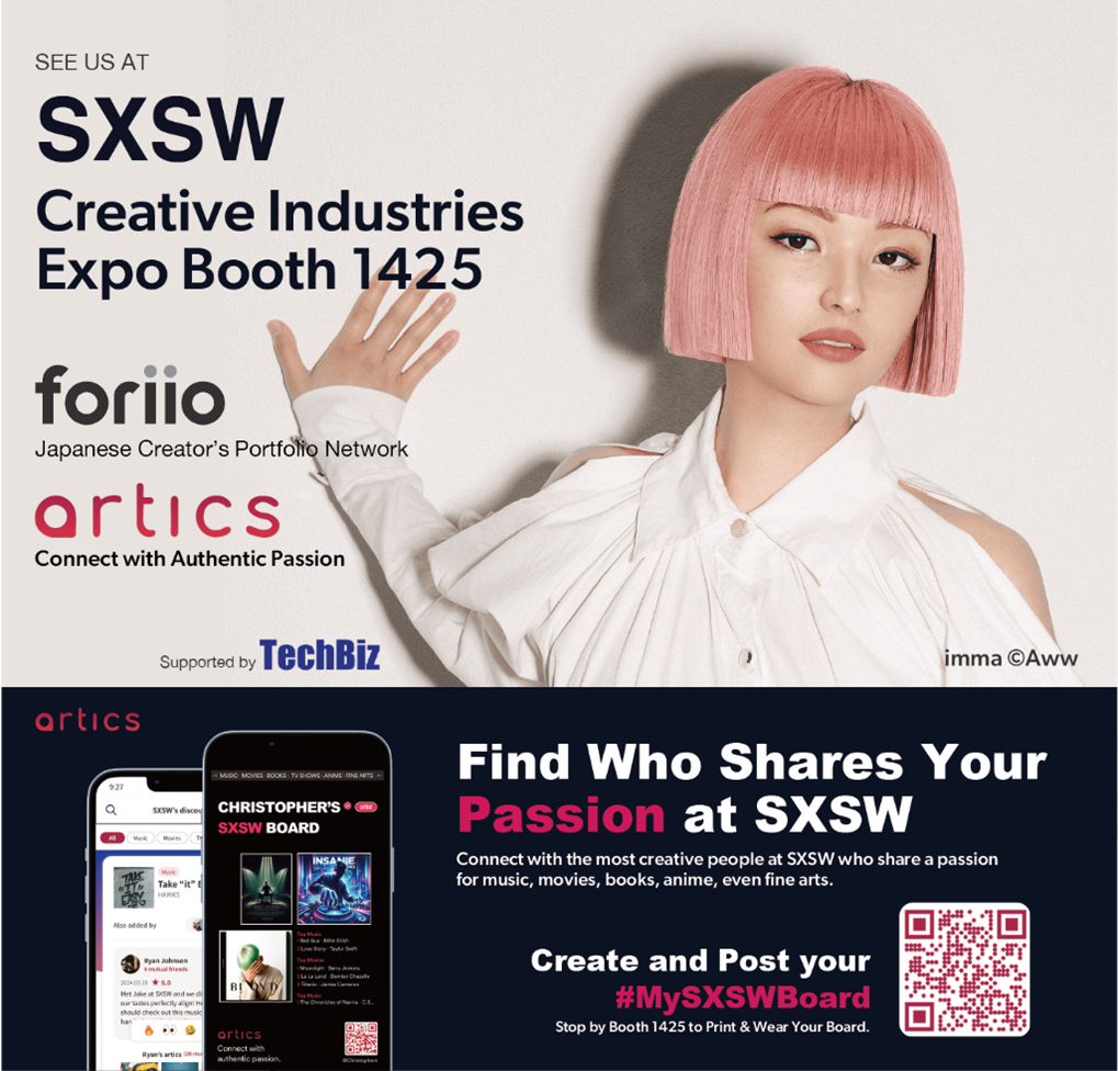 アメリカ・テキサス州オースティンにて開催される、音楽/映画/テクノロジーを含むクリエイティブの祭典SXSW2024(サウス・バイ・サウスウエスト)における展示会「Creative Industries Expo」(3/10〜13)にTechBizプログラムの採択企業(artics, (株)foriio)がTechBizブース(Booth No.1425)内に出展いたします。