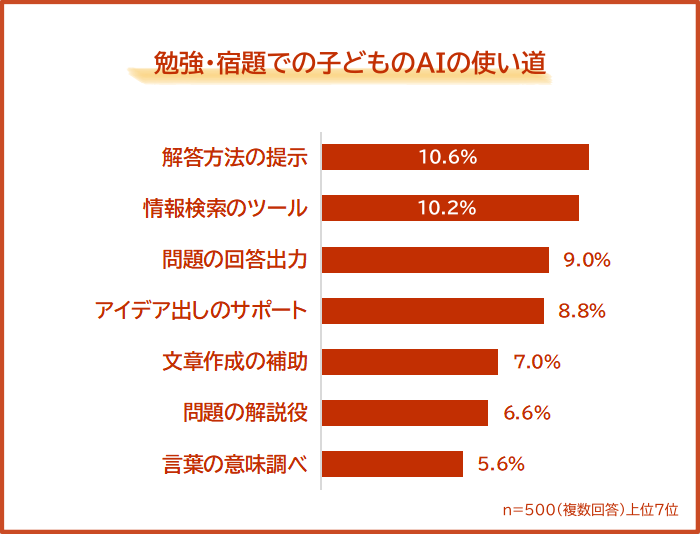 「勉強・宿題での子どものAIの使い道」の1位は「解答方法の提示(10.6%)」、僅差の2位は「情報検索のツール(10.2%)」でした。
