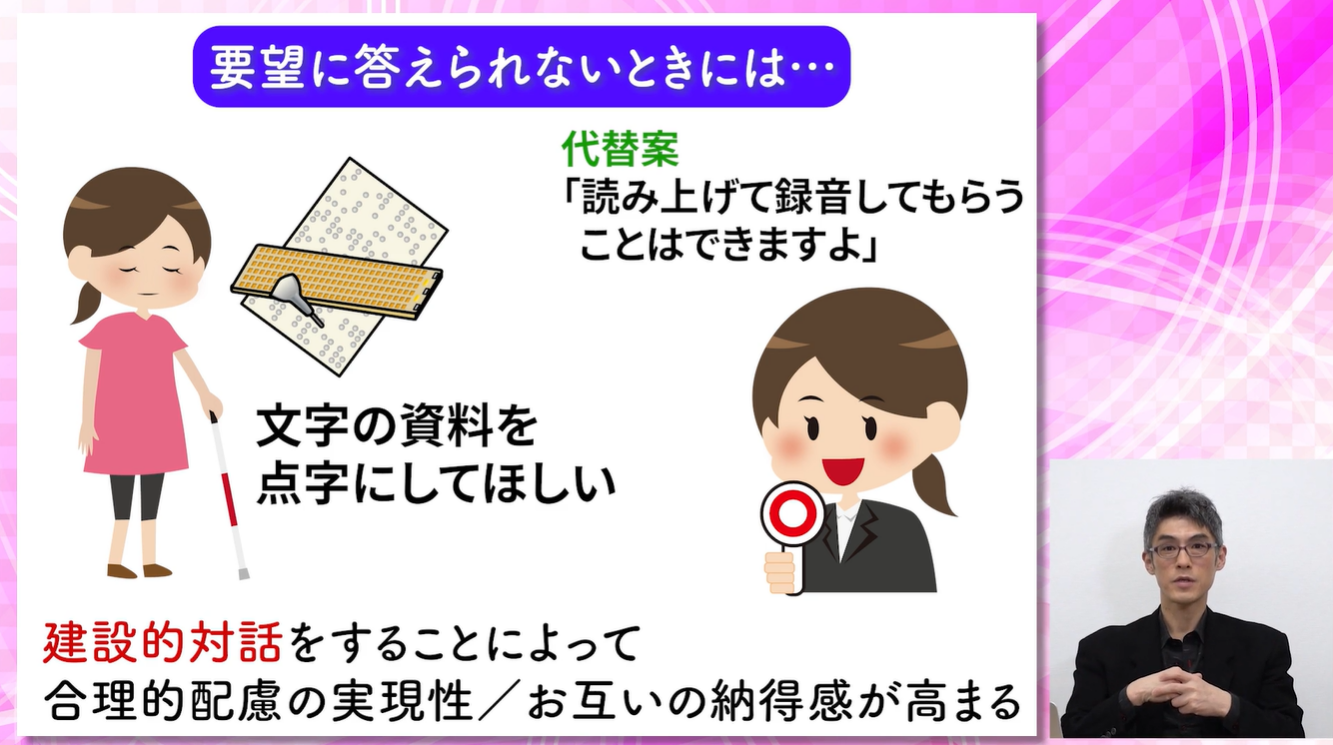 合理的配慮は「見つける」と「手伝う」の要素から成り立ちますが、障がいのある方のご要望に必ずしも答えられるケースばかりではありません。
