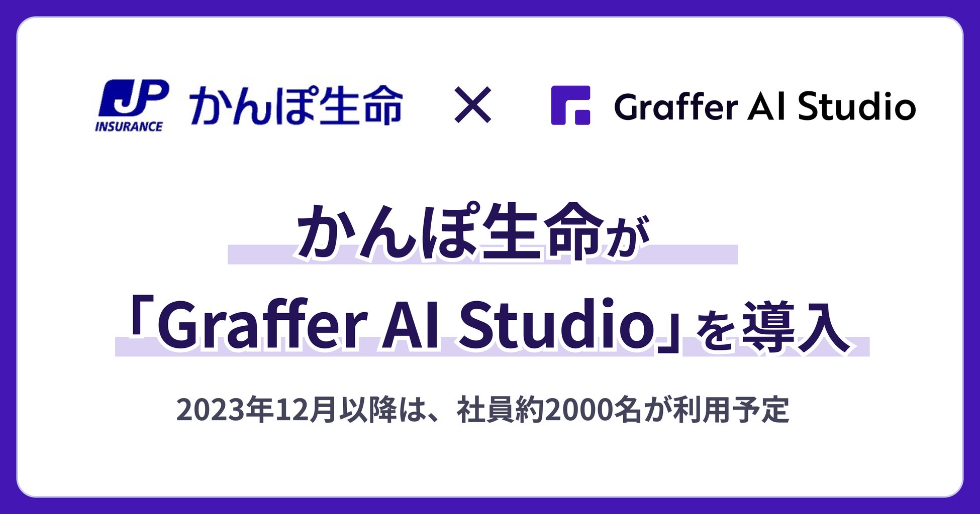 導入当初は、かんぽ生命の保険商品やサービスを企画する部署などに在籍する社員約200名を対象に先行的に導入を開始し、社内における好事例を創出及び収集した上で、2023年12月以降には本社の他の部署へも拡大し「Graffer AI Studio」を活用します。これにより、かんぽ生命は、既存の文章要約や議事録作成などの定常業務において生産性を向上し、企画立案時のアイディア出しなどのイノベーション創出を通じて、お客さまの生活に寄り添うサービス提供に注力してまいります。将来的には社内に蓄積されたノウハウを活用した照会対応業務等における活用を見据え、さらなるお客さま体験価値の向上を実現します。