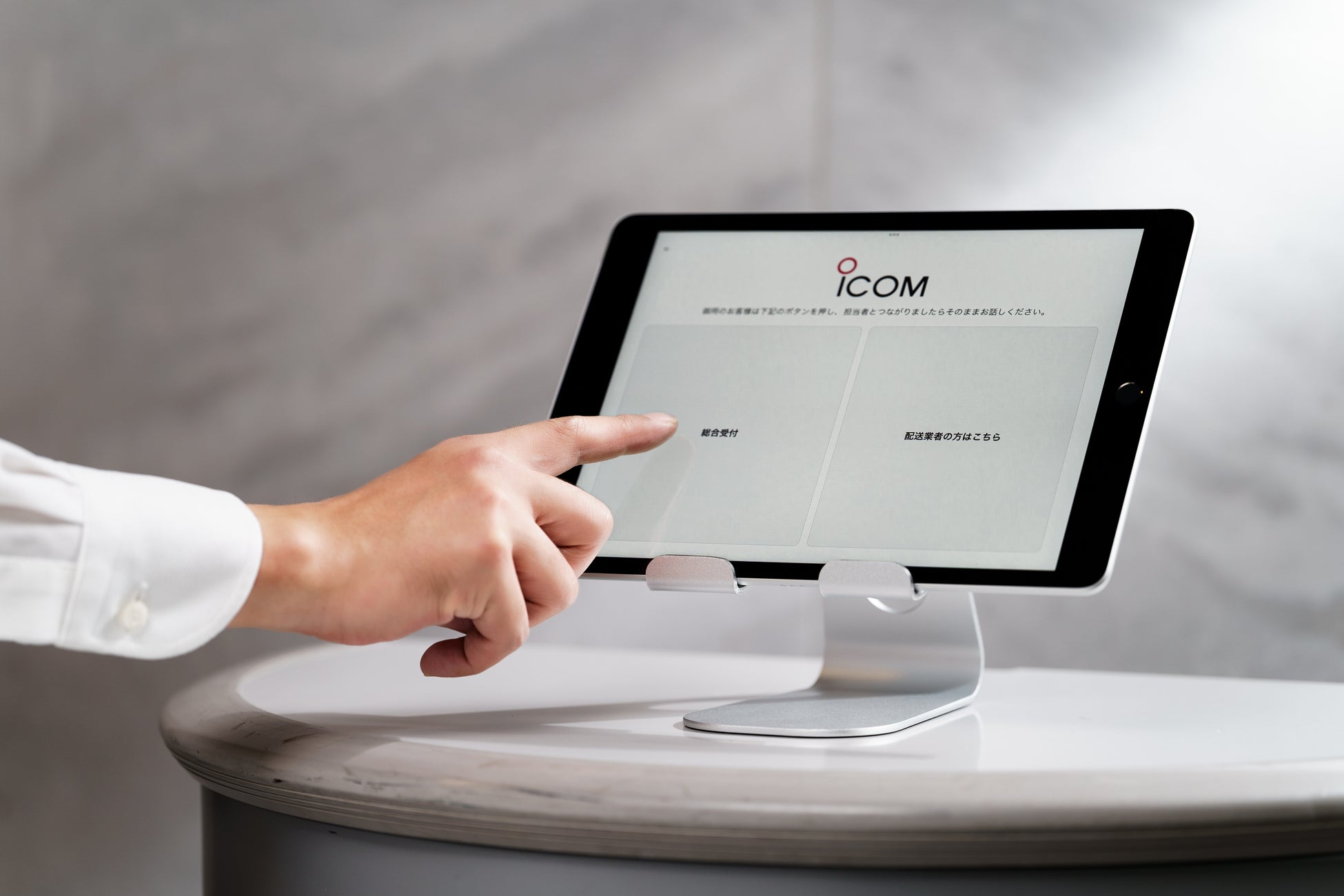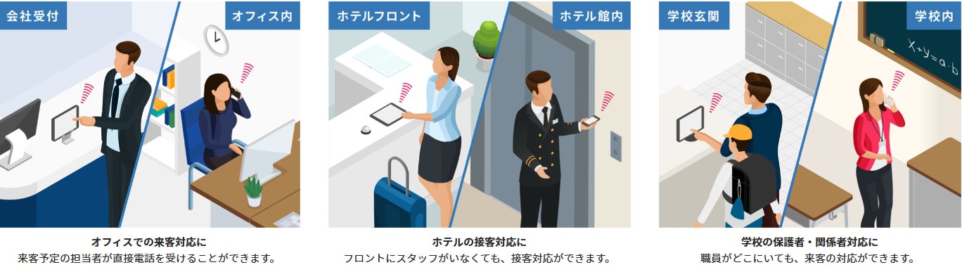 オフィスや、施設などに端末を設置することで、来訪者の受付に対応。受付業務の軽減や業務効率の向上をサポートします。タブレットでの運用が可能で、部署や、担当者など、電話宛先の設定は、ユーザー側で細かくカスタマイズができます。