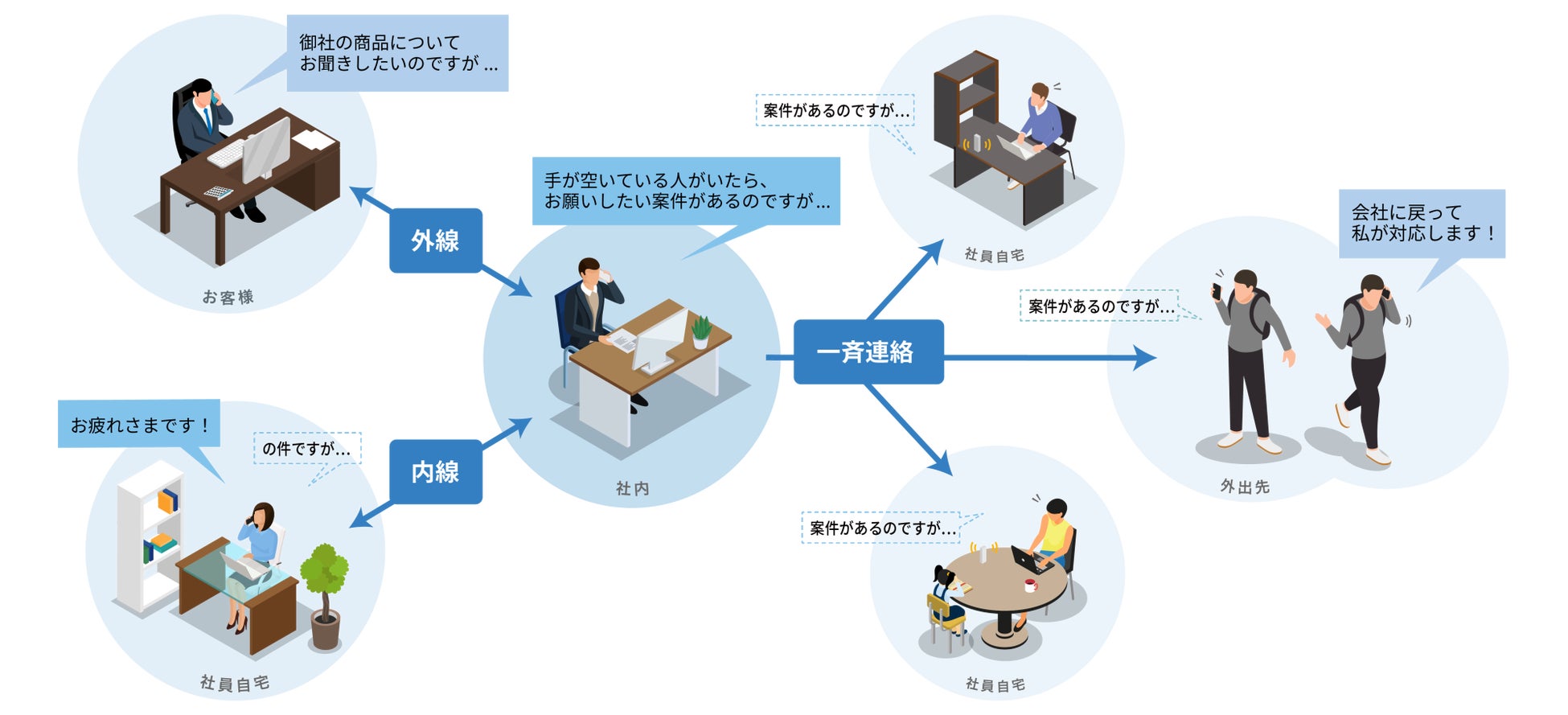 IP200APPは、Android™/iOS®のスマホに対応するIPフォンアプリ です。アプリ上で、内線・外線・一斉連絡ができます。ビジネスフォン・IPトランシーバーとほぼ同等の電話・トランシーバー機能が、IP200APPに収容。また、当社telelink®シリーズ(無線モバイルIPフォンなど)やIPトランシーバー、固定電話などさまざまな通話端末とも通信できます。