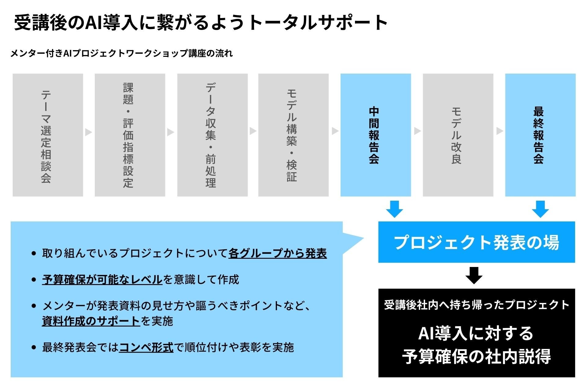 ③実際のAI導入に向けた社内説得プレゼンの要素まで講座プログラムに含んだトータルサポート体制