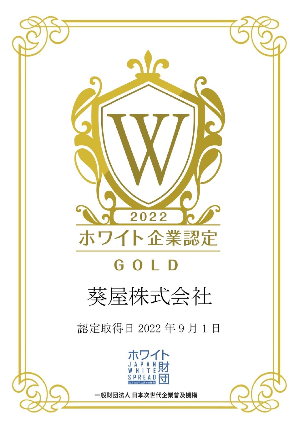 2022年9月1日、葵屋株式会社が、一般財団法人日本次世代企業普及機構(通称:ホワイト財団)が運営する「ホワイト企業認定 ゴールド」を取得しましたことをお知らせいたします。