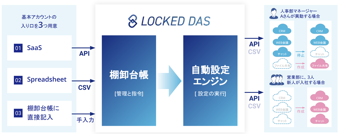 「権限セット」は入社/異動時に発生する複数のSaaSアカウントの権限を横断的に自動設定できる機能です。入社/異動時は、部署、役職、プロジェクトごとに、複数のSaaSのIDや権限管理業務が発生します。この業務はこれまで情報システム担当者(以下情シス担当者)にとって大きな負担となっておりました。『LOCKED DAS』を活用すると社員のSaaSのIDを「棚卸台帳」で管理し、「自動設定エンジン」で自動設定することが可能です。(図1、2)