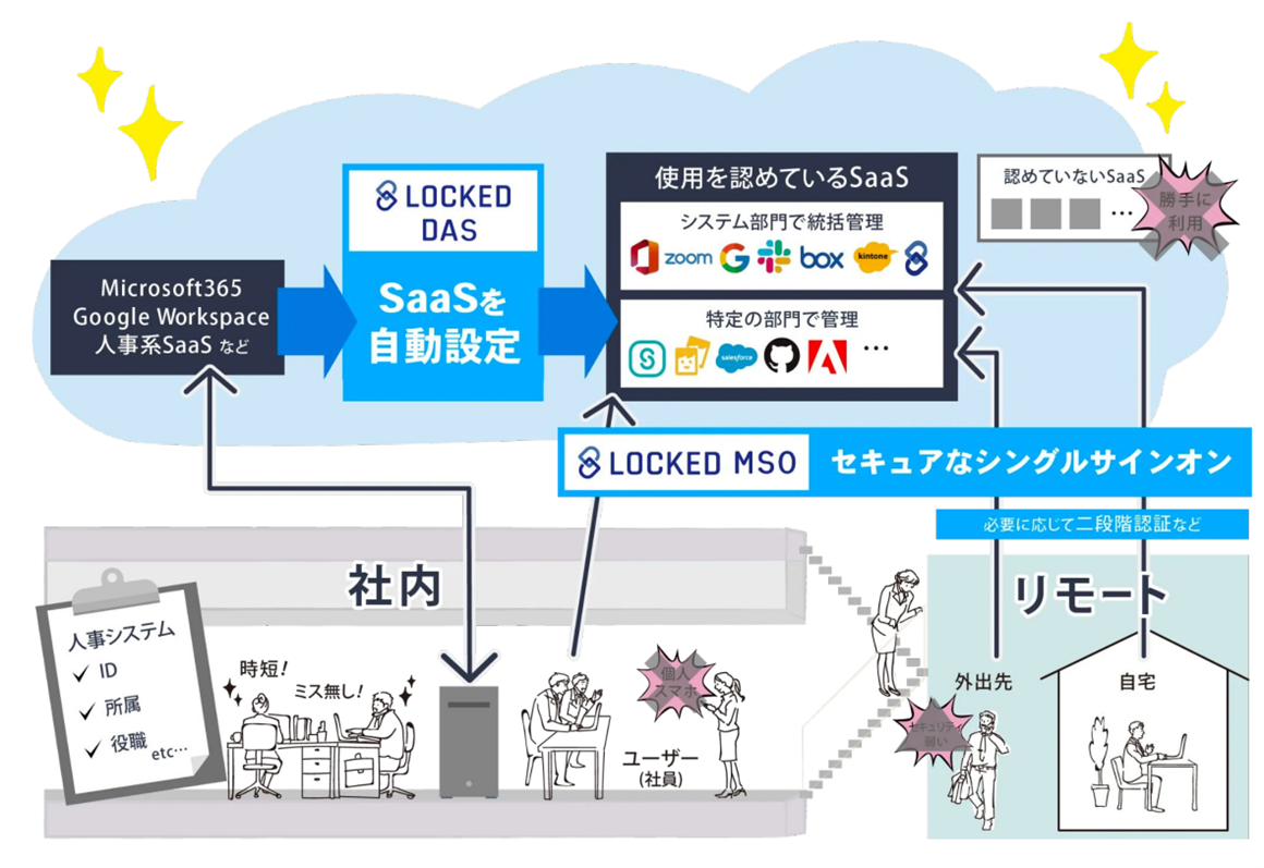 『LOCKED MSO』は、きめ細かい制御が可能なシングルサインオンツールです。様々なSaaSとのSAML認証に加えて、独自システム・オンプレミスのシステムとも連携が可能です。二段階認証や生体認証が利用可能なため、高いセキュリティが担保できます。さらに、ユーザーの属性などの様々な条件を組み合わせることができるため、アクセス制御を柔軟に行えます。