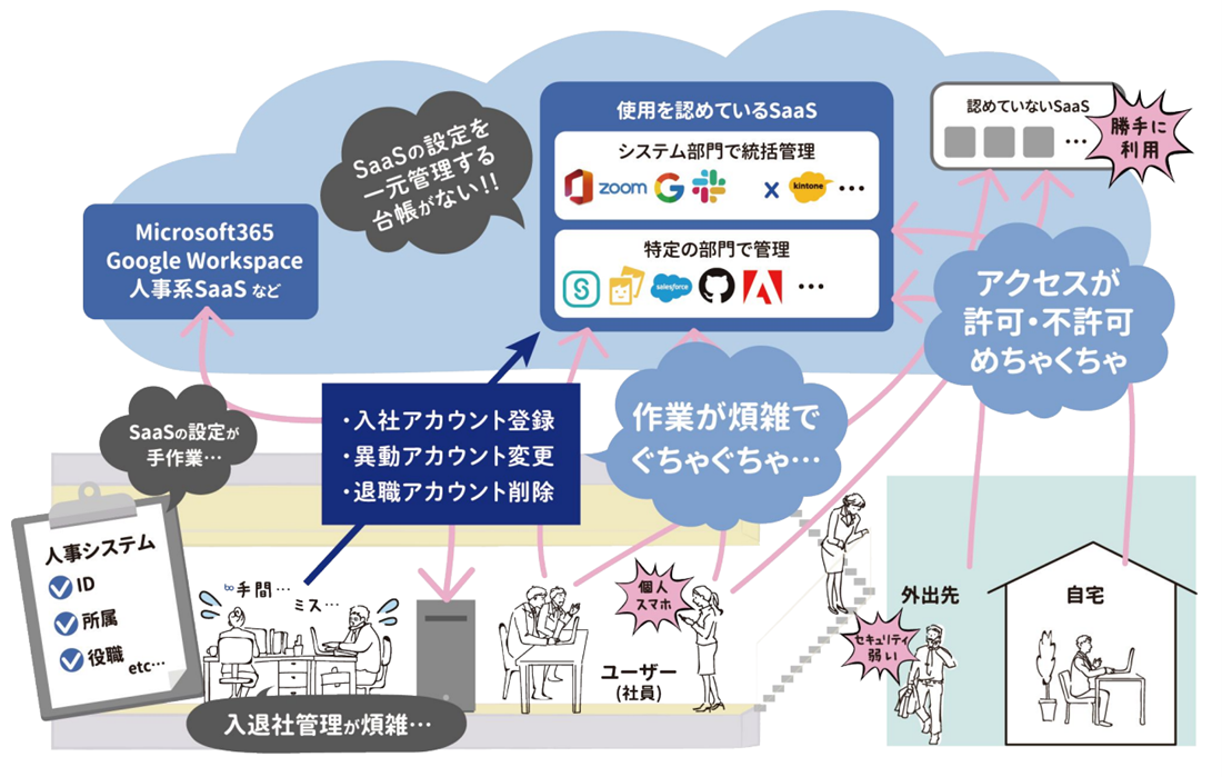 主な課題は、①入退社、異動時の煩雑なアカウント設定、②退職者のアカウント消し忘れ、③設定のルールの管理が煩雑なことです。