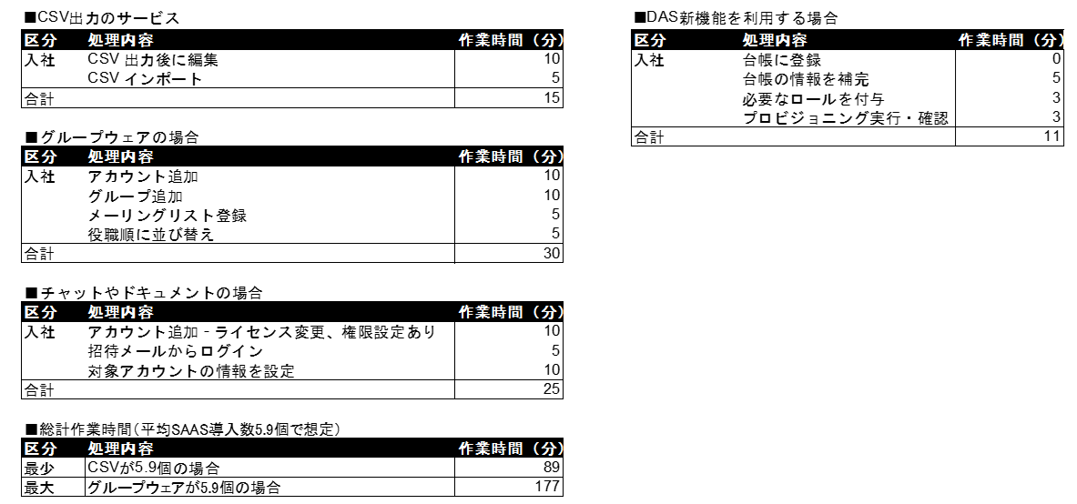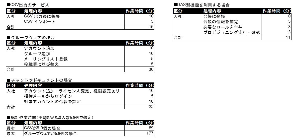 企業で導入されているSaaSの平均数5.9個*を想定して業務削減率を試算すると、入社時に一人当たり最少でも約89分かかる時間を『LOCKED DAS』の新機能を使うと11分に削減がすることが見込まれます。つまり約9分の1以下に業務時間の削減が可能です。