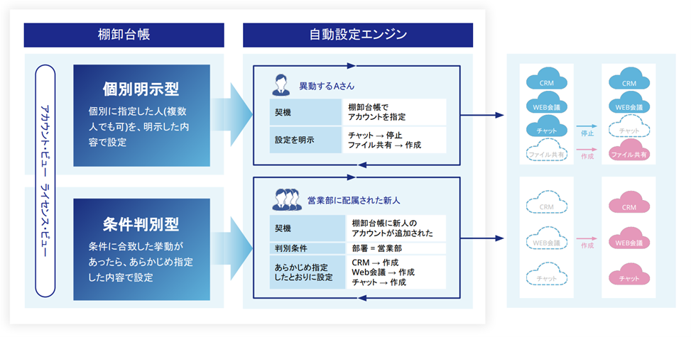 1つ目は「条件判別型」です。部署や役職などの属性固有の条件で同一の権限を設定する方法です。例えば、営業部に配属された新人に同一の権限設定をするようなケースです。「棚卸台帳」に新人のアカウントが追加されたタイミングで、CRMやWeb会議など複数のSaaSに対して予め指定した内容で権限が一気に設定できます。