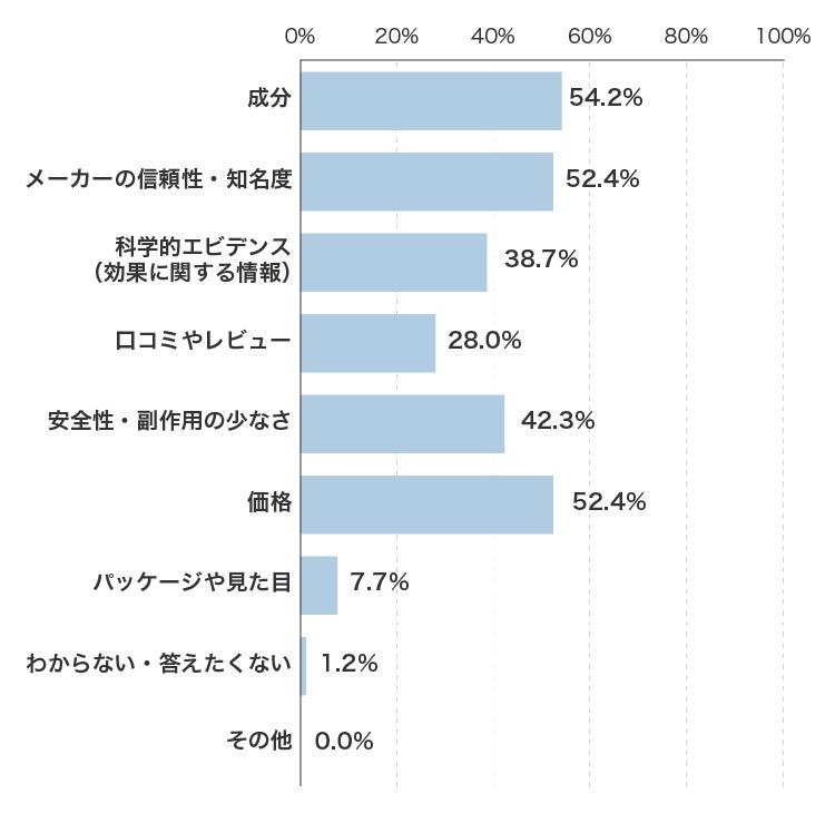 サプリを選ぶ際の重視するポイントを複数回答で聞いたところ、成分、メーカーへの信頼、価格がそれぞれ半分をこえました。口コミやレビューが意外に少ないのは、それ自体への信頼度の低さかもしれません。