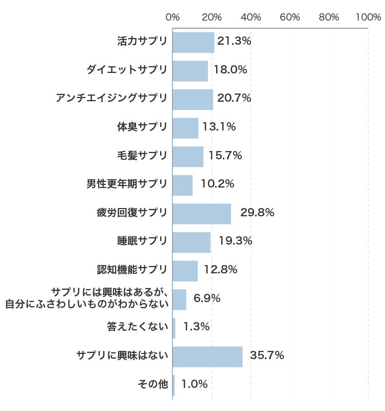 アンチエイジング、ダイエットなど、見た目を意識したサプリもかなりの割合の人が興味を示しています。
