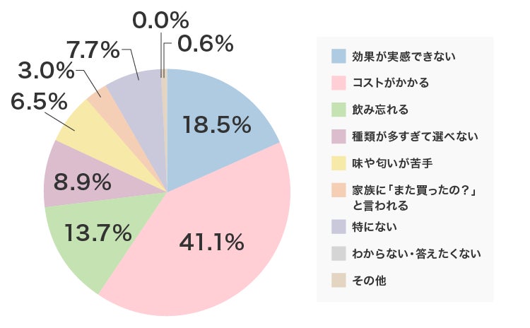 サプリメントの服用を継続するための、最大のハードル(障害)を聞いたところ、コストがかかるという回答が4割を占めました。