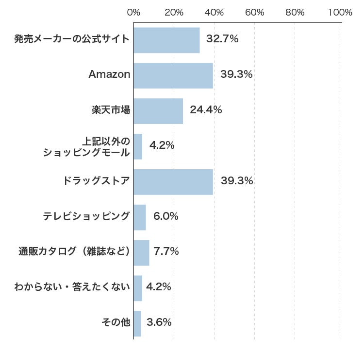 Amazon、ドラッグストアでの購入が同じ比率でトップに並びました。そのあとには、メーカーの公式サイトが続いています。