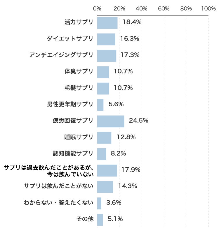 ダイエット、アンチエイジング、体臭、毛髪、睡眠などに関連したサプリも10〜20%程度の人が服用しているようです。
