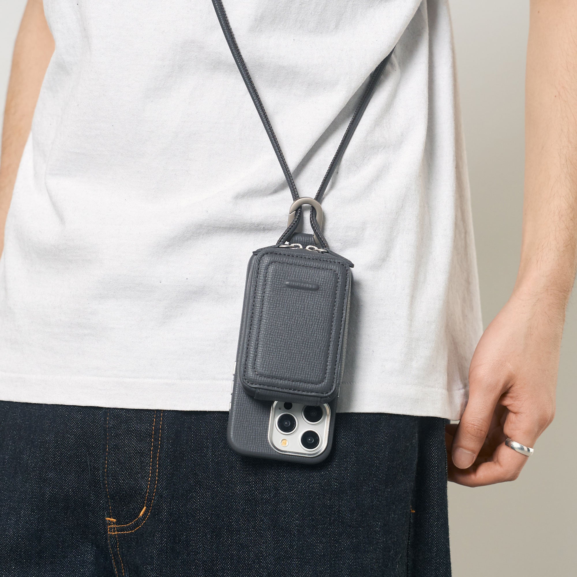 『レザーストラップ + iPhoneケースセット』は、「カラビナ付iPhone本体ケース」と「ストラップ一体型アクセサリー」をMagSafeの磁力とカラビナで接続する仕様のスマホショルダー。
