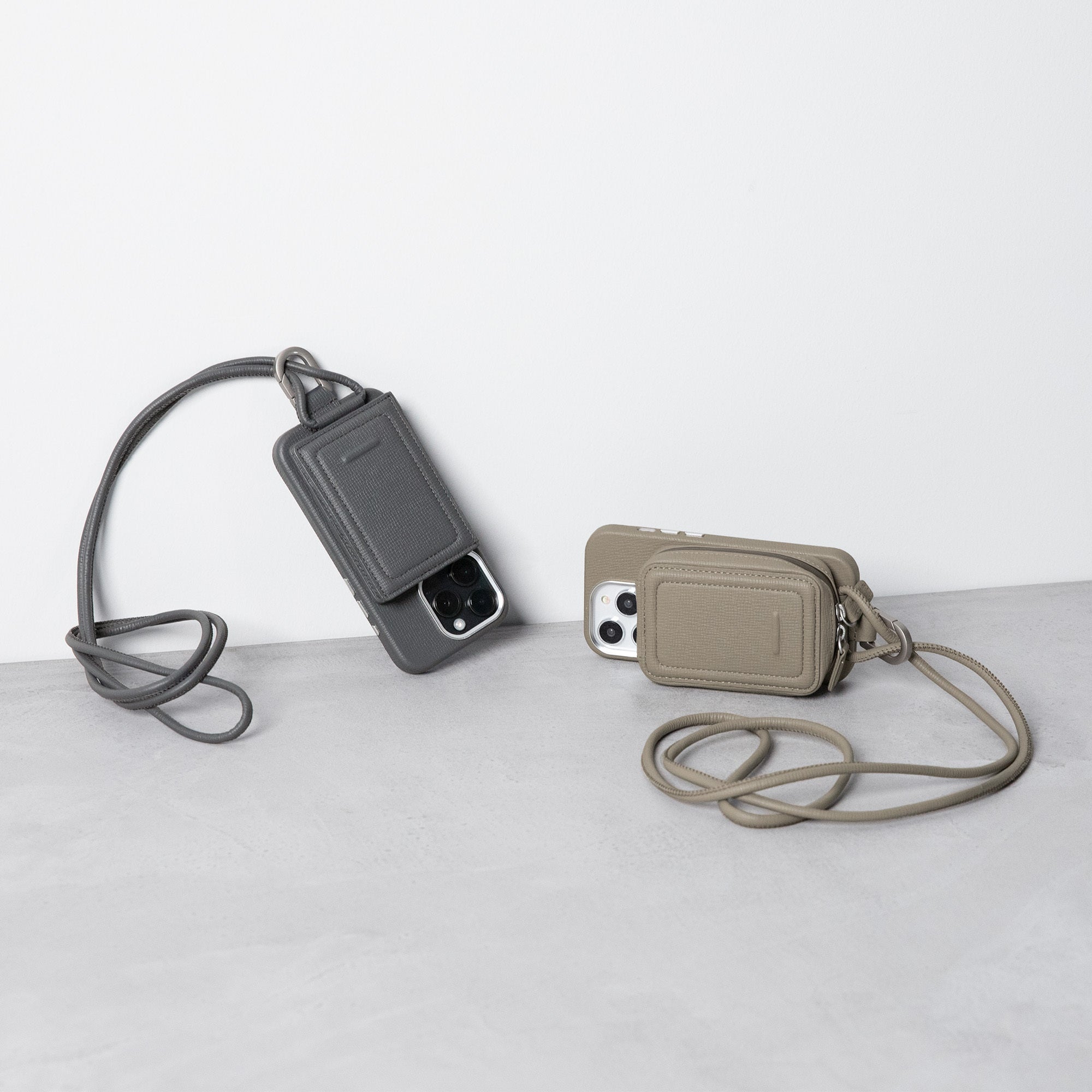 「ストラップ一体型アクセサリー」として、カードを2〜3枚収納できる「カードケース」、カードと少量のキャッシュを持ち運べる「ウォレット」、AirPodsなど厚みのあるアイテムを収納可能な「マイクロバッグ」を展開し、用途に応じてお選びいただけます。