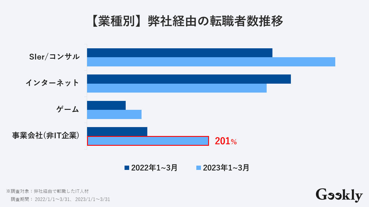 その中でも事業会社への転職者数は前年比201%と大幅に増加しており、特にエンジニアの転職者数は222%に急増していました。