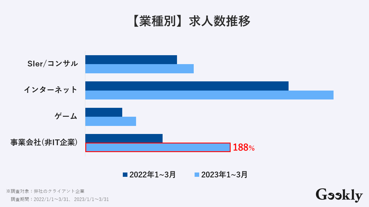 最も伸びている業種は事業会社の188%で、化学・消費材メーカーや流通・小売など、今までIT人材を積極的に採用していなかった企業の求人が増加しています。