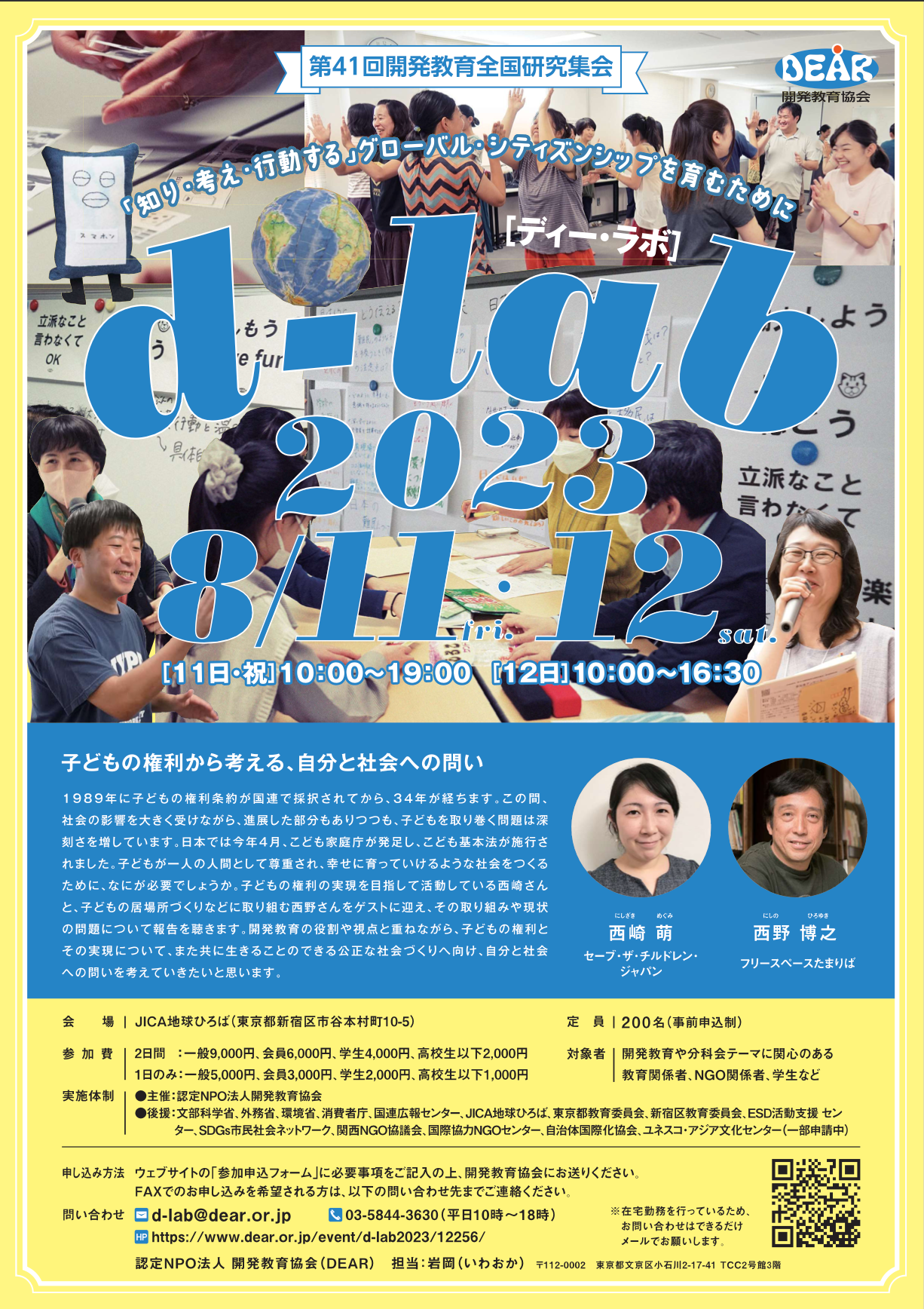 今年で41回目を迎えるd-lab(ディー・ラボ/開発教育全国研究集会)は、今年4月のこども基本法施行とこども家庭庁発足を受けて、子どもの権利を実現するために必要なこととはなにか、そして開発教育の役割や視点と重ねながら、自分と社会への問いを皆さんと一緒に考えたいと思います。全体会ではゲストに西崎萌さん(セーブ・ザ・チルドレン・ジャパン)、西野博之さん(フリースペースたまりば理事長)のお二人をお招きし「子どもの権利から考える、自分と社会への問い」についてお話ししていただきます。