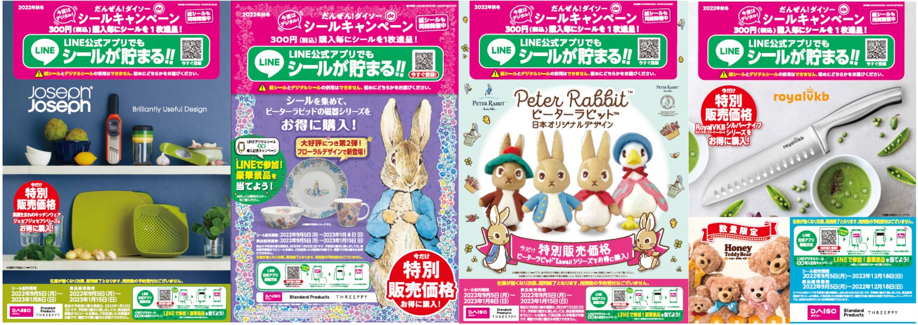 シールキャンペーンでは、シール数に応じて、Royal VKBシルバーナイフシリーズ、ハニーテディベアシリーズ、ジョセフジョセフシリーズ、ピーターラビットTMKawaiiシリーズ、ピーターラビットTM磁器シリーズなどの商品を特別販売価格でご購入いただけます。