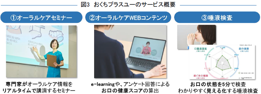 当社は、長年人々のオーラルケアの習慣づくりを推進してきた知見を活かし、企業・健康保険組合や自治体と連携しながら、お口から人々の健康増進を実現していきたいと考え、「おくちプラスユー」のサービスを開始しました。本サービスは法人向けウェルビーイングサポートサービスとして、オーラルケアに関する情報や唾液検査などのメニューを提供しています。2022年7月の開始以来、健康経営に取り組まれている企業を中心にサービスを提供し、2023年10月にはサービスを受けた従業員数が累計1万人を突破しました。