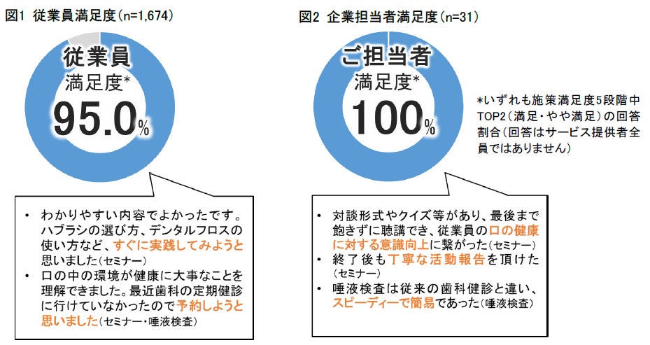 また、導入いただいた企業のご担当者の満足度は100%となっており(図2)、「従業員の口の健康に対する意識向上に繋がった」や「セミナー終了後も丁寧な活動報告があった」「唾液検査はスピーディーで簡易であった」などのお声を頂いております。