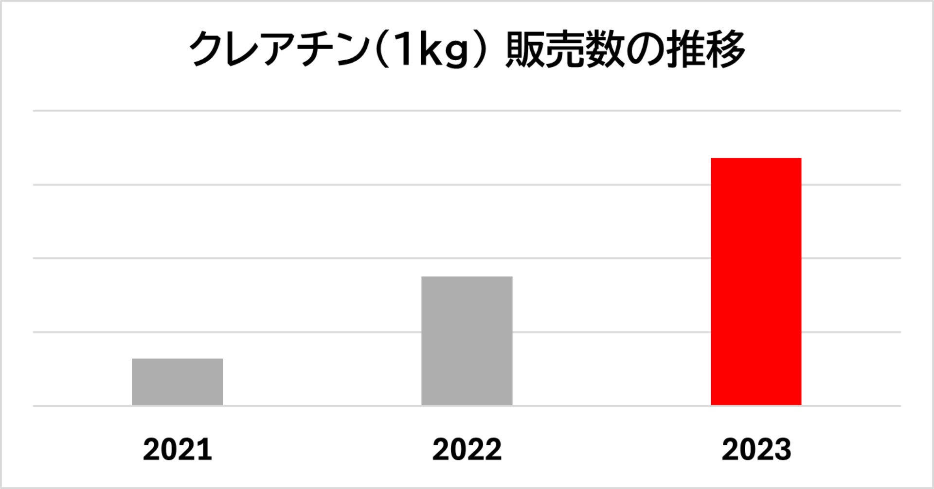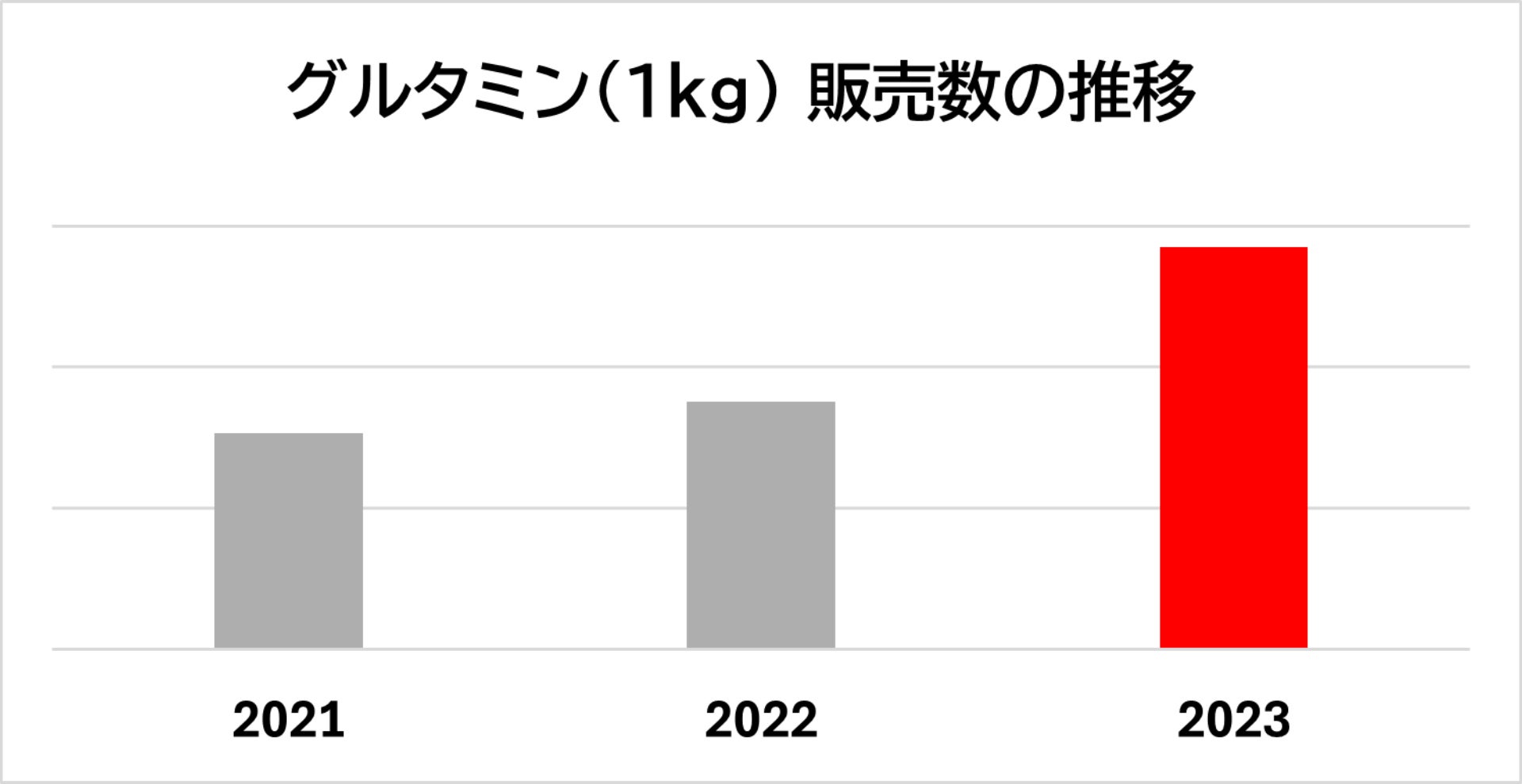 2021年~2023年のUltimate Lifeの販売データでは、クレアチンは約418%、グルタミンは約86%、販売数が増加しています(いずれも風味なし)。また、2023年には、クレアチンはプロテインの一番人気商品の約1.6倍、グルタミンは同プロテイン商品と同程度の販売数となりました。以上から、単一アミノ酸への関心が高まっているとみられ、今後も需要拡大が予想されます。