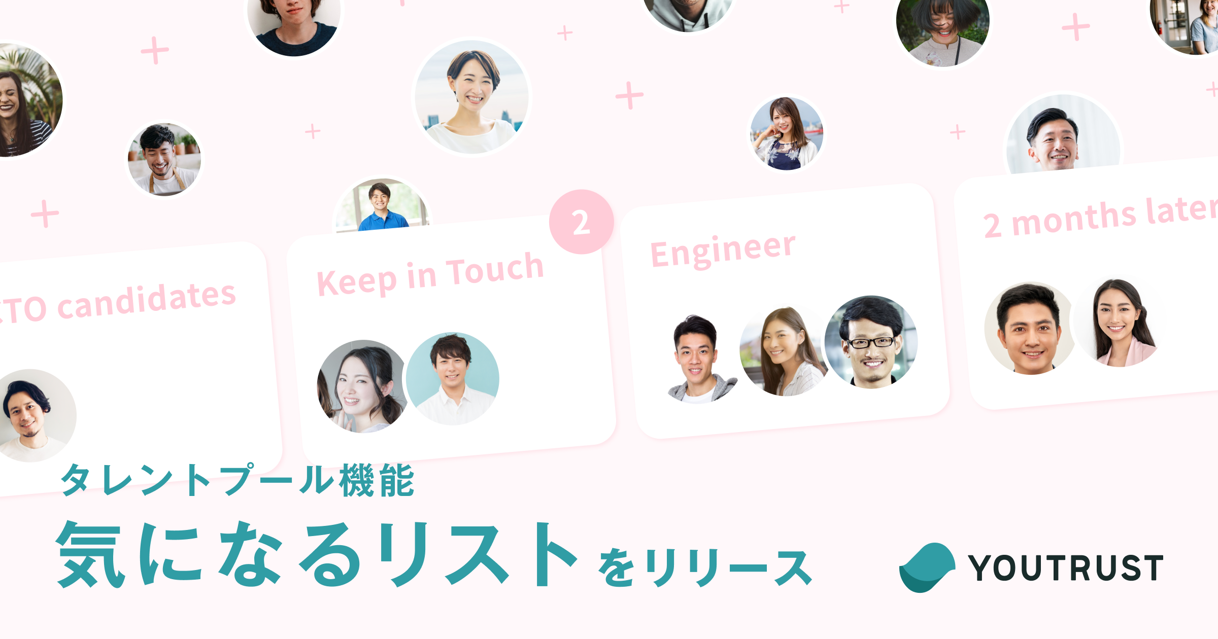 YOUTRUSTは「日本のキャリアSNS」として、転職潜在層・顕在層双方との接点を採用企業様に提供してきましたが、最適なキャリア機会の創造をさらに増やすべく、つながりを資産にして最適なタイミングに連絡するためのタレントプール機能「気になるリスト」の開発・提供に至りました。