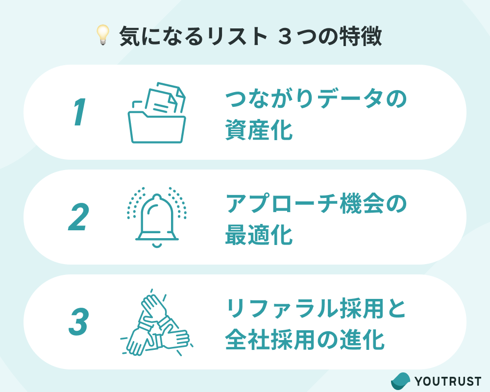 YOUTRUSTが提供するタレントプール「気になるリスト」には、3つの特徴があります。