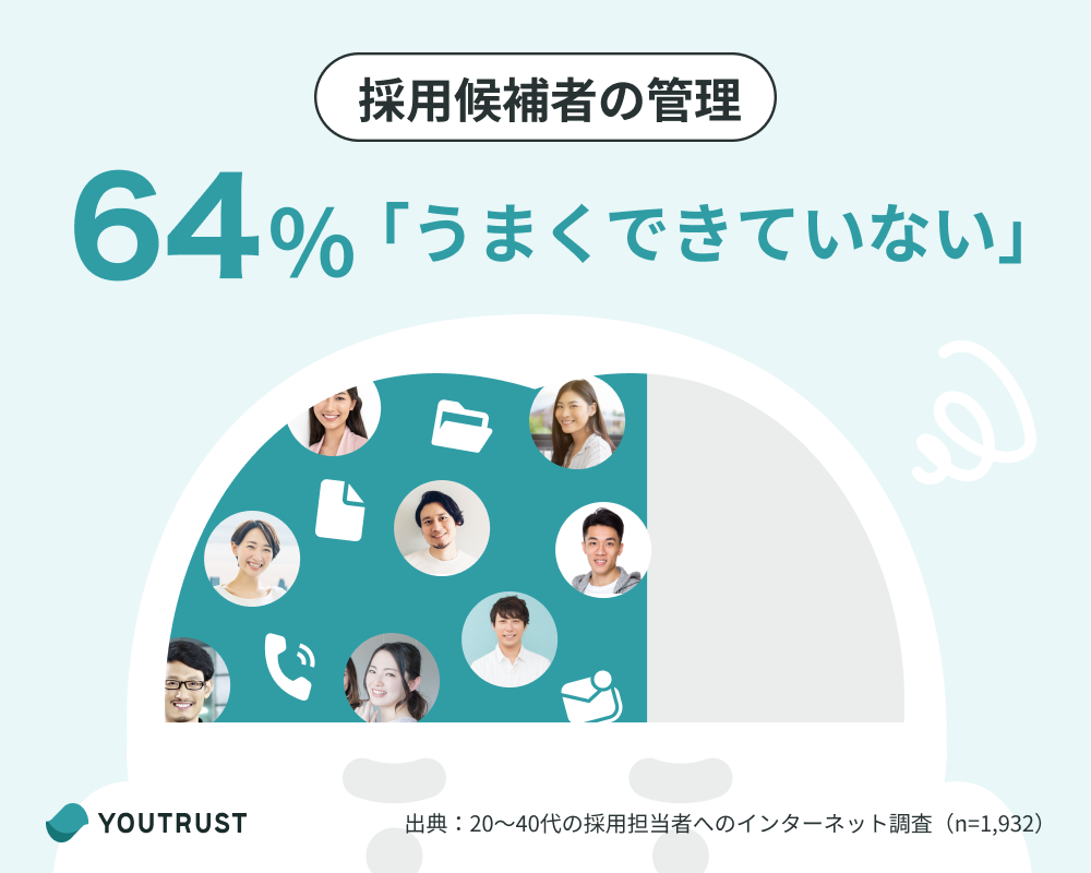 優秀な人材獲得が難化する中で、採用は人事・採用担当に限った業務ではなく、全社員が取り組むものへと位置付けが変わってきています。一方で、企業の6割が候補者管理に課題を感じており、全社採用の加速と併せて解決すべきポイントでもあります。