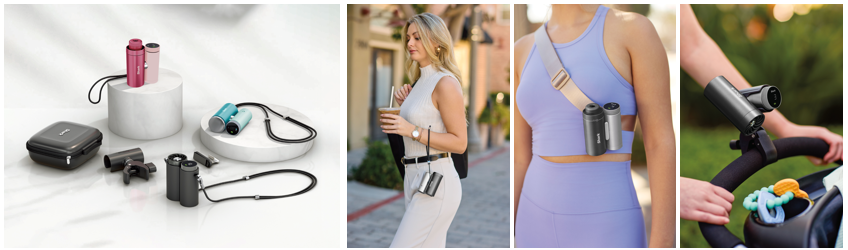 手持ちや卓上だけではなく、専用のアクセサリーをご使用いただくことでさまざまなシーンで活用いただけます(※4)。首からぶら下げてハンズフリーで使用、クリップやクランプを使ってバッグやベルト、トレーニングマシンやベビーカーなど色々な場所に取り付けるなど、豊富なアクセサリーで使い方がさらに広がります。
