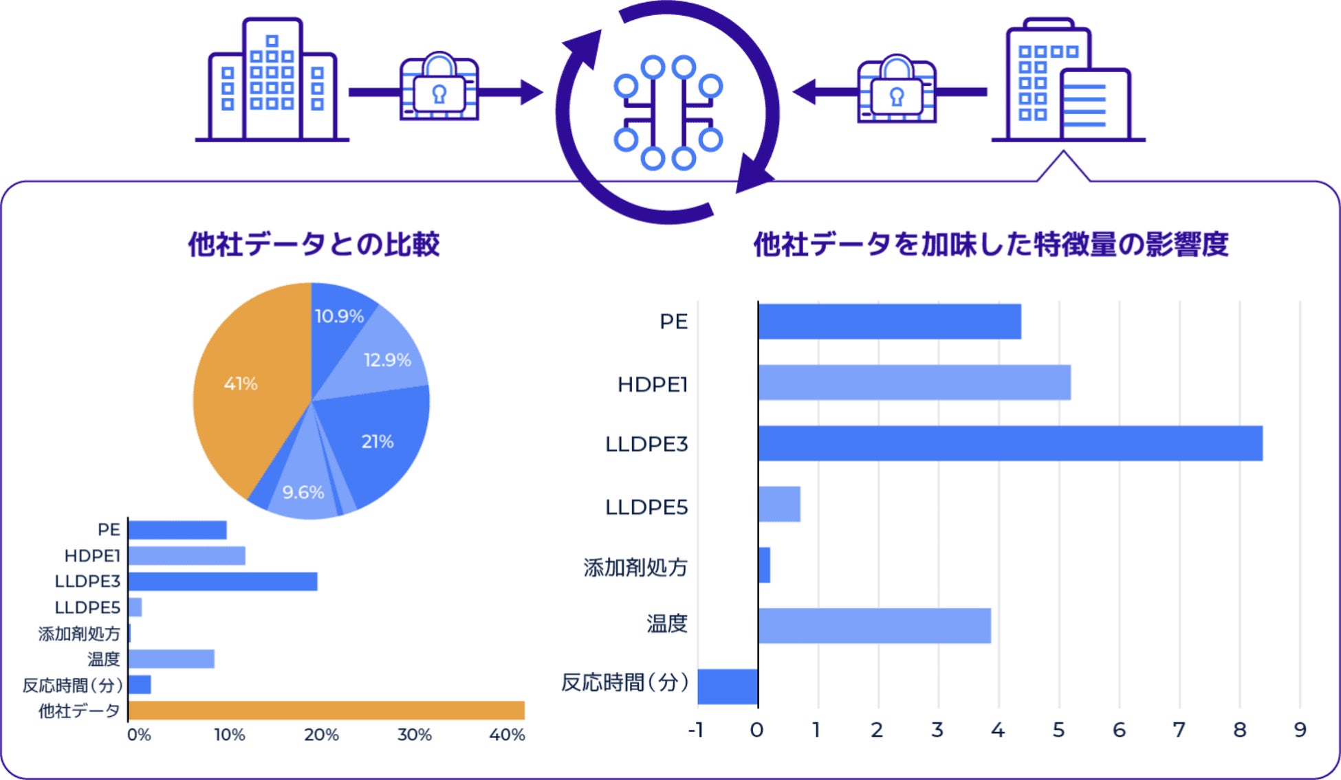 企業間データで生成したAIモデルを活用することでデータに基づくインサイトを得ることを可能とします。また、他社データを加味した自社データの影響度を、詳細データは隠しつつもグラフィカルに表示。従来の口頭でのすり合わせにデータでの表現を加える事で、双方のすり合わせコミュニケーションの加速を実現しています。