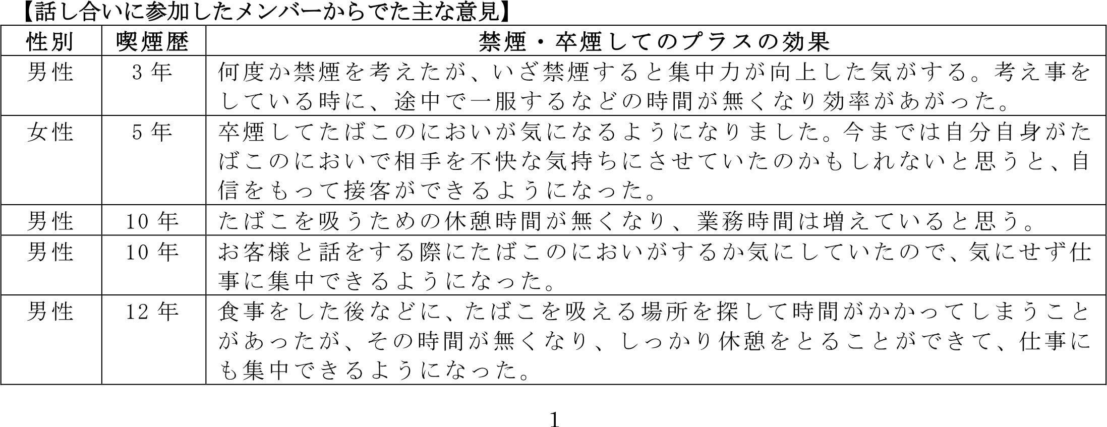 喫煙者に話を聞くと「煙草をやめたい」と思ったことや、過去に禁煙を試みた経験があるという人が数多くいます。一方、卒煙者だけの話し合いにおいて卒煙した社員から話を聞くと、「集中力が持続するようになった」「においを気にせず、自信をもってお客様に説明ができた」「煙草休憩の時間が無くなり、業務が効率化した」などの意見が多く、卒煙したことで仕事へのプラス効果が出ていることが明らかになりました。