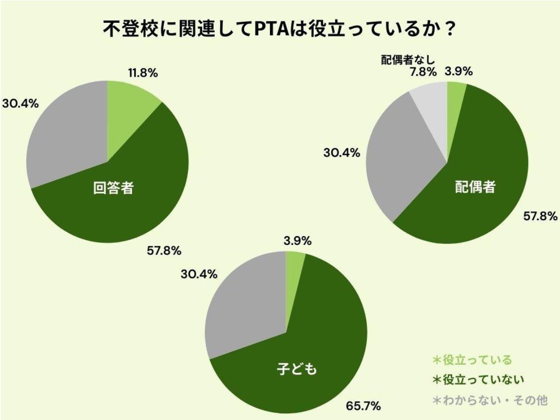 不登校・行き渋りに関連して、PTAが、回答者本人・配偶者・子どもにとって役立っているかどうか尋ねました。そのすべてにおいて、半数以上が「役に立っていない」と回答しています。