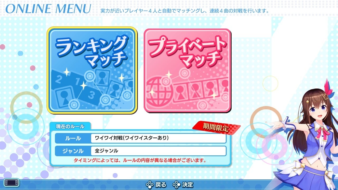 大型アップデートにて、オンラインで接続されたプレイヤー同士が最大4人同時に対戦を楽しめる「オンライン通信プレイ」が追加されました。オンライン通信プレイでは、「ランキングマッチ」と「プライベートマッチ」の2つのモードが用意され、プレイスキルを競うガチ対戦や離れた仲間とゲームで繋がったりとゲームの楽しみ方が一層拡がります。
